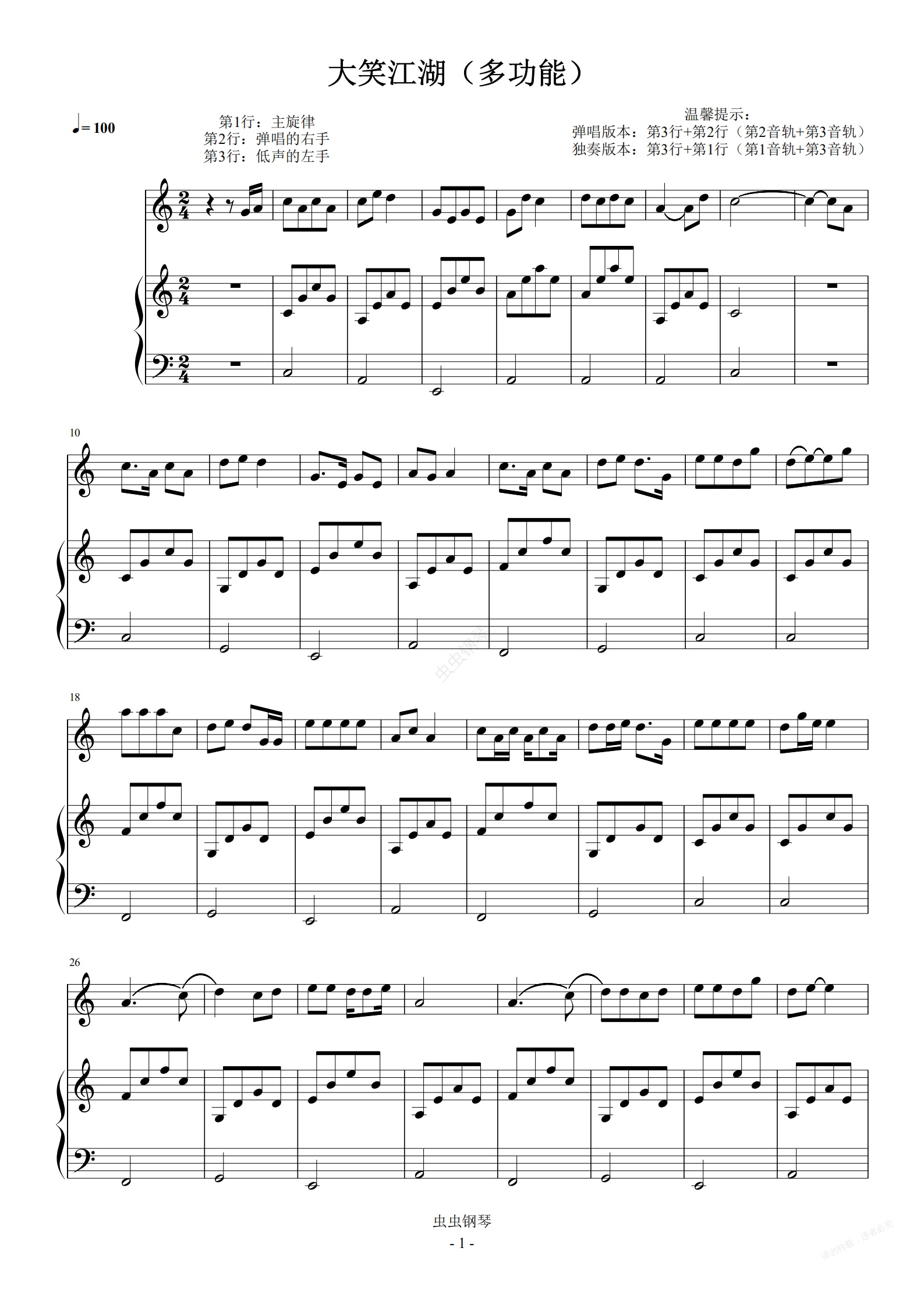 钢琴谱:大笑江湖 弹唱+独奏 简易 (小汤)