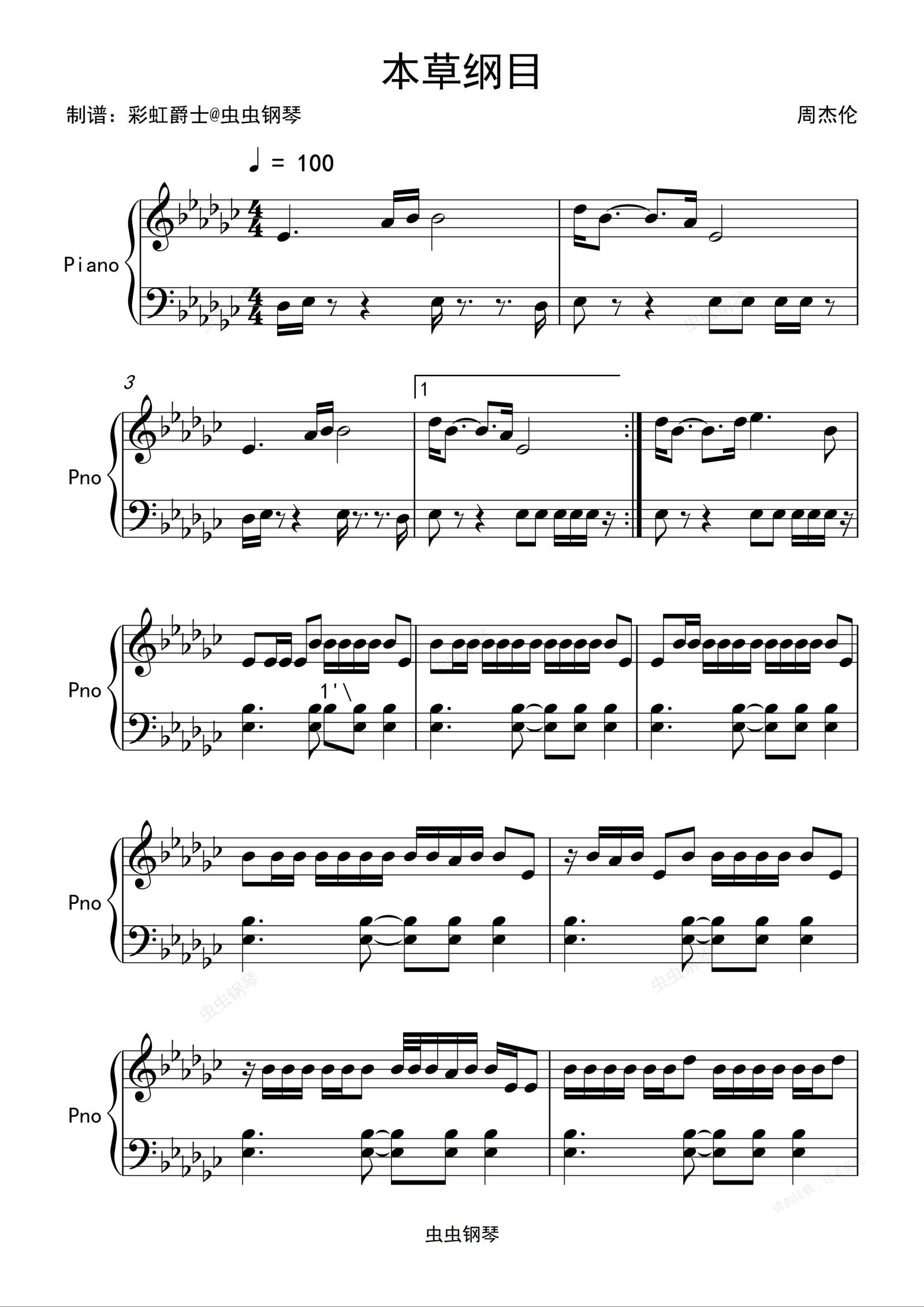 钢琴谱:本草纲目 周杰伦 简单版 极简 完整版 原调