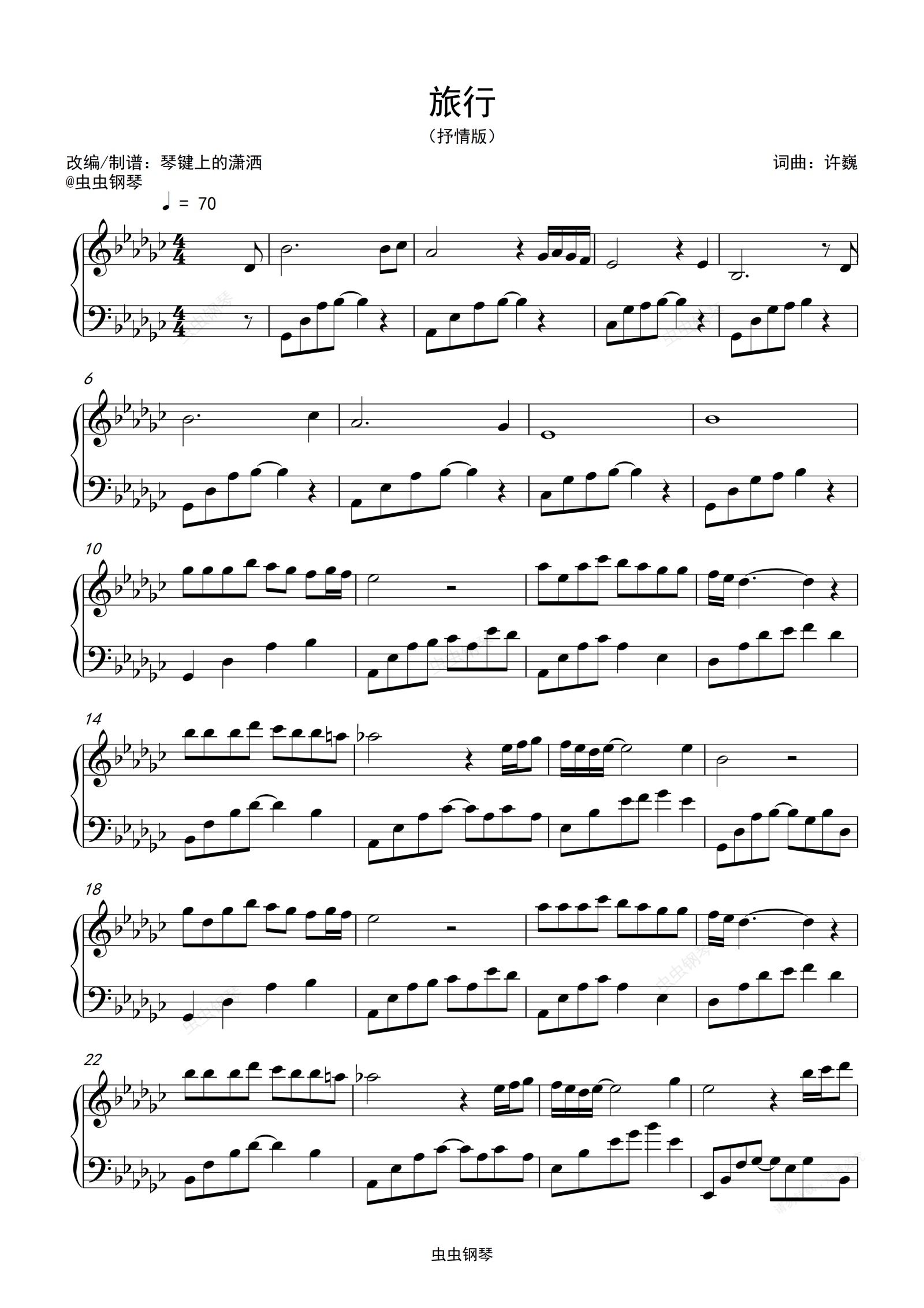 钢琴谱:《旅行》(抒情版)-许巍-完美降G调独奏