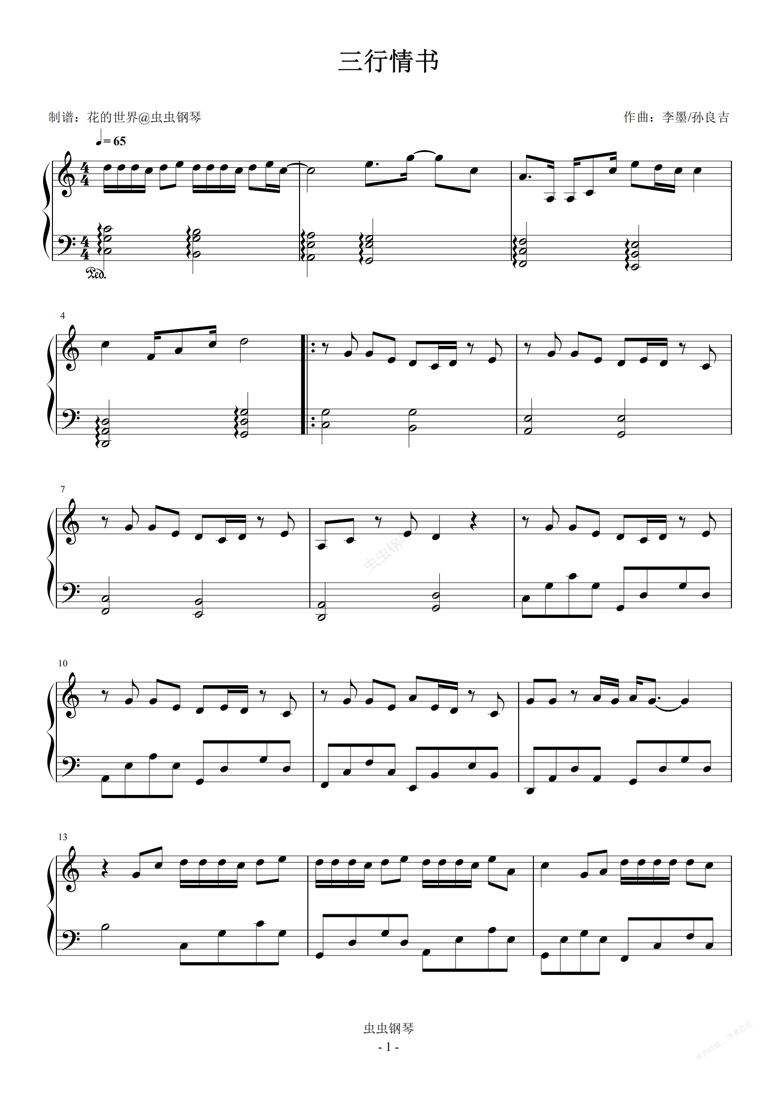 钢琴谱:三行情书 C调简易版 蔡文泽