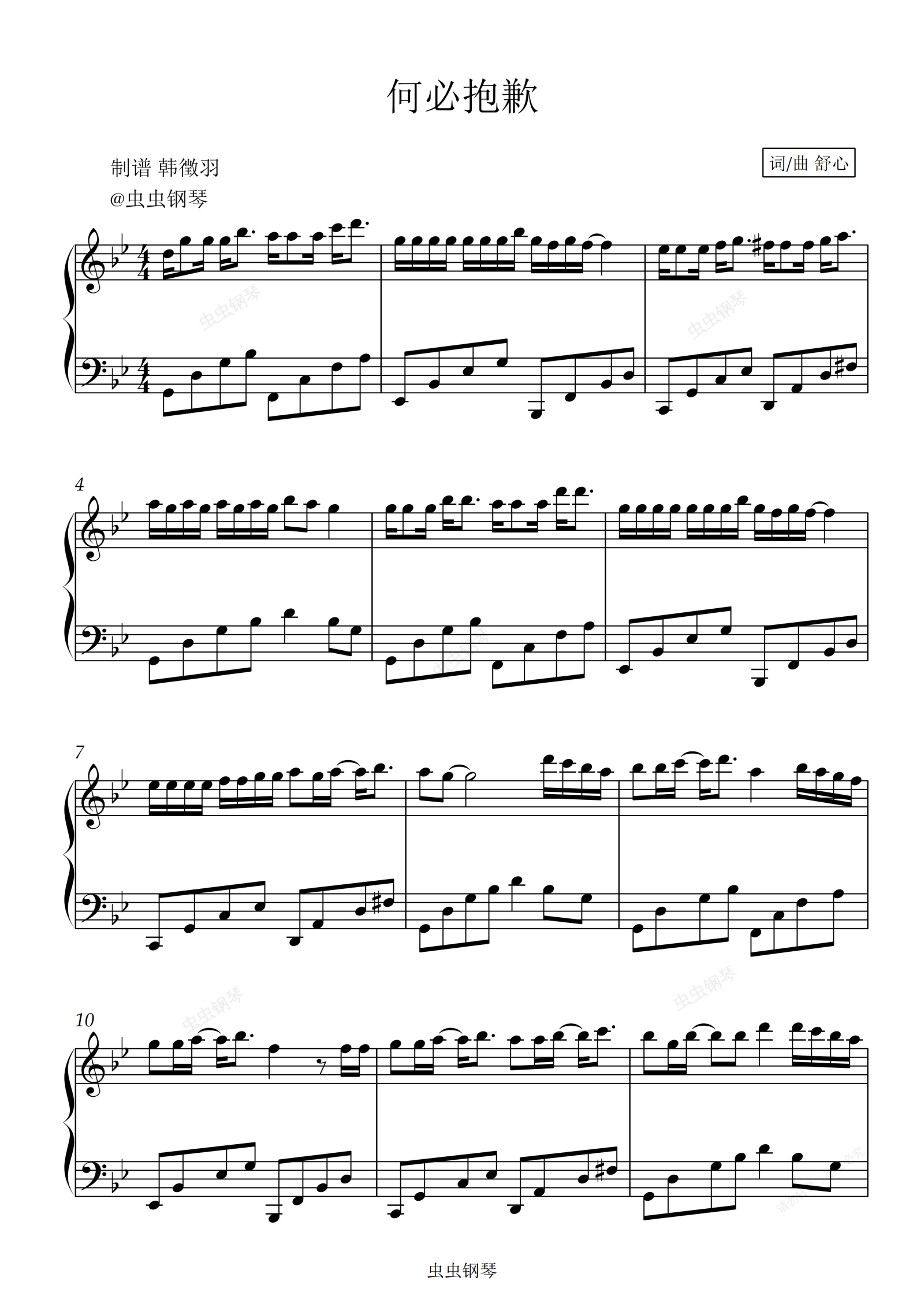 钢琴谱:何必抱歉 吴瑭 原调 简易版