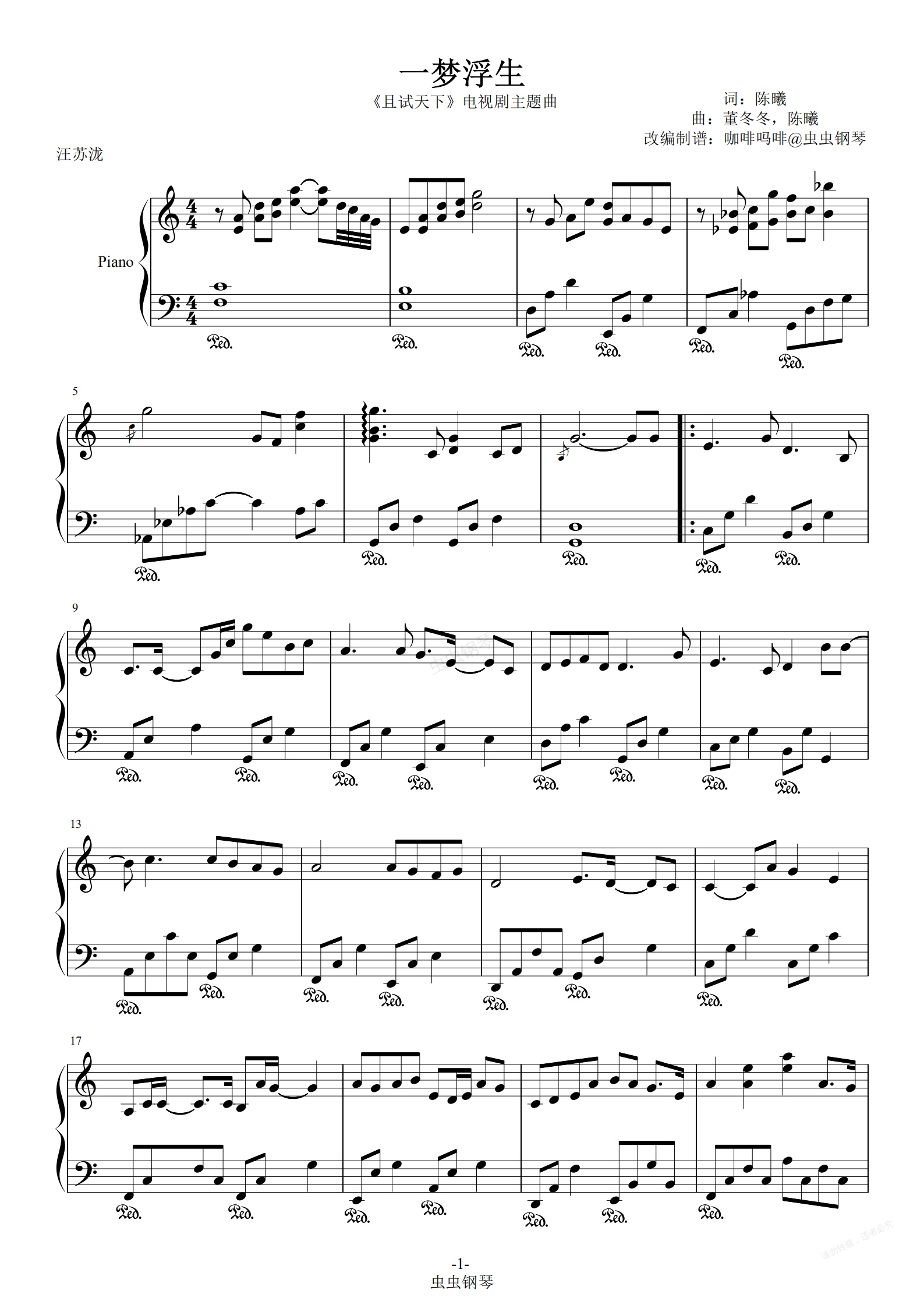 钢琴谱:一梦浮生-汪苏泷 精制C调独奏谱