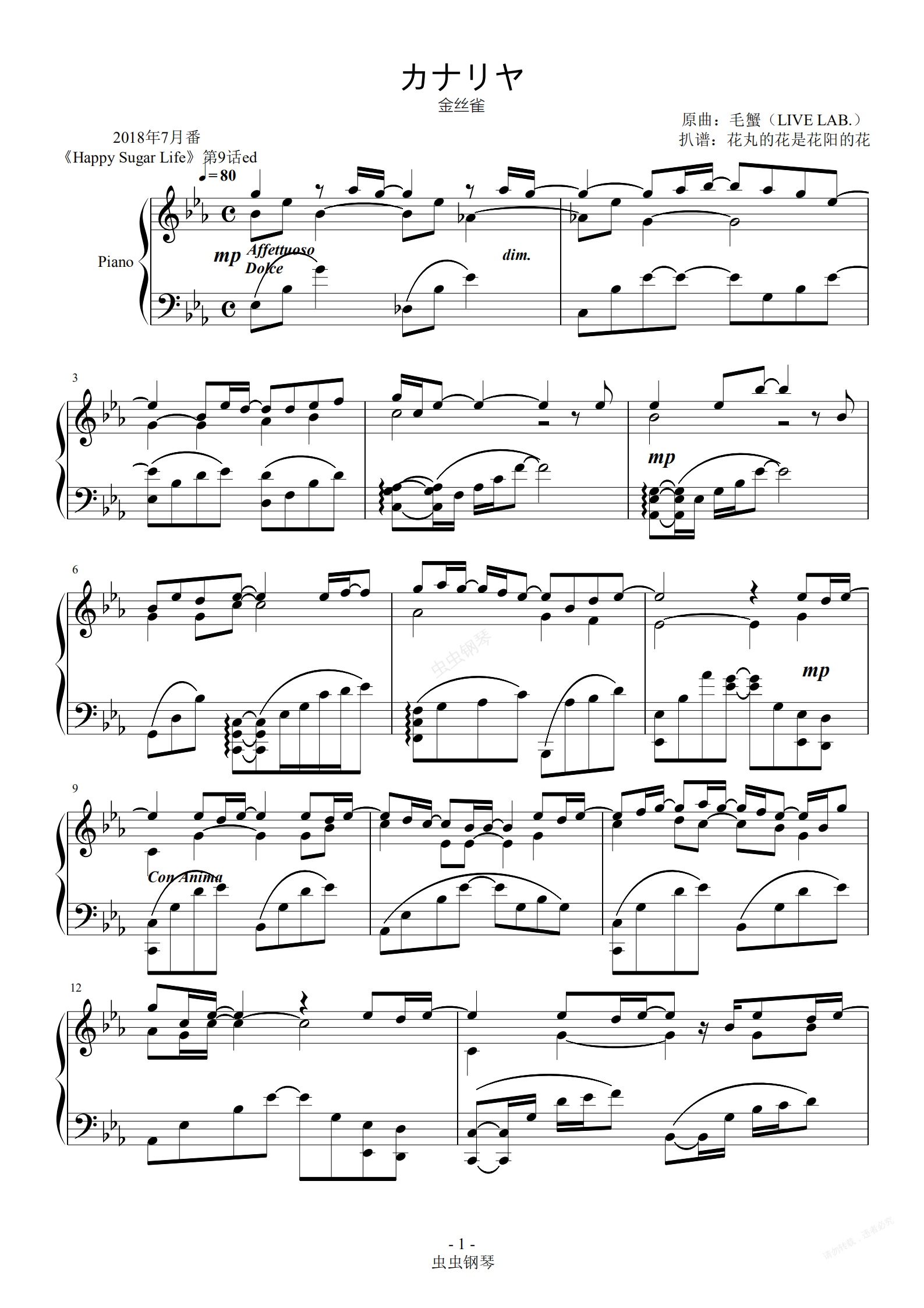 钢琴谱:【经典番】Happy Sugar Life 第9话插曲~カナリヤ(金丝雀)
