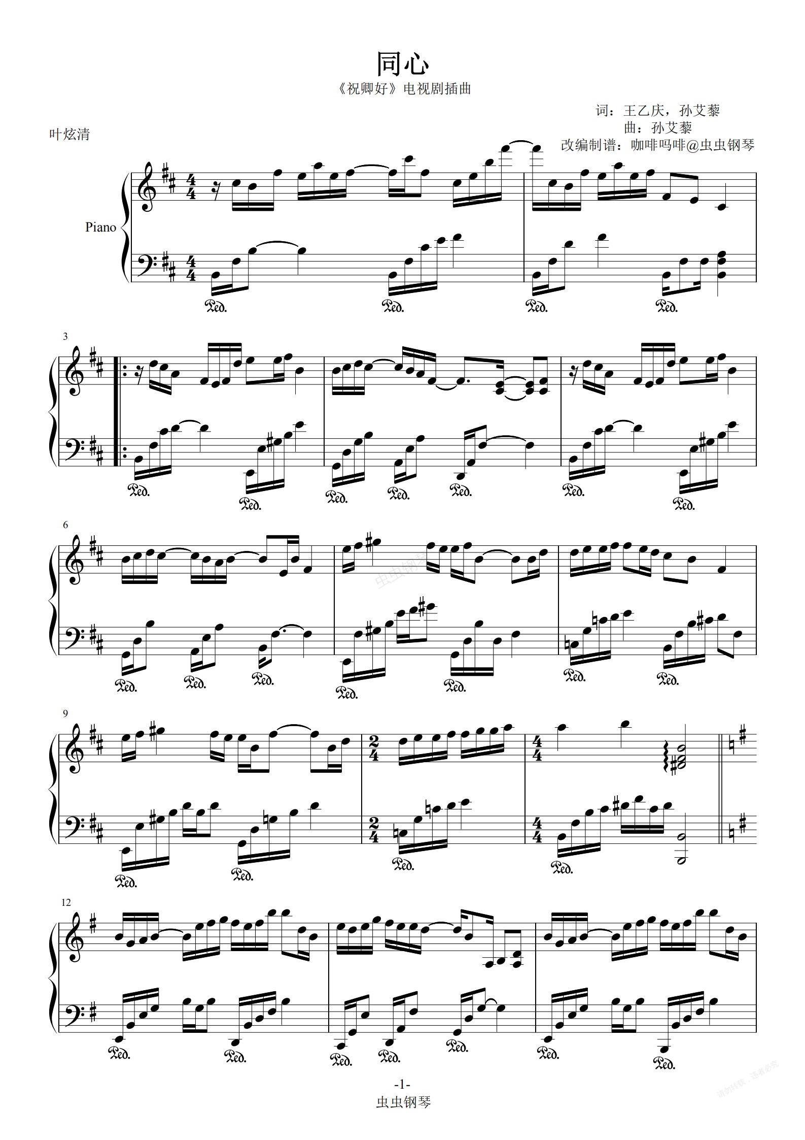 钢琴谱:同心-《祝卿好》插曲 叶炫清 D调独奏谱
