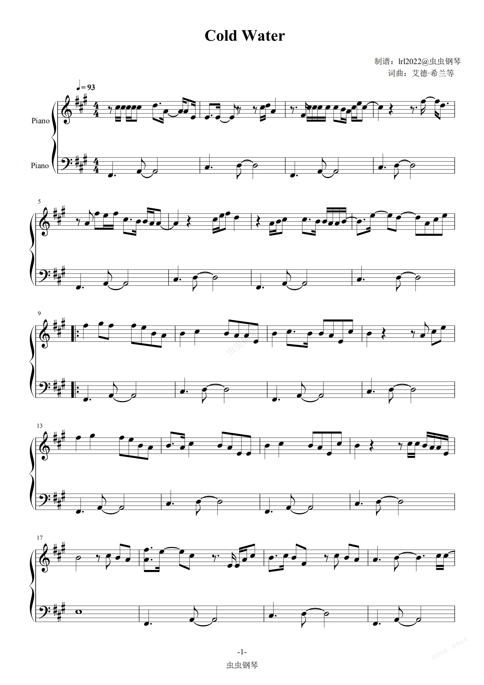 钢琴谱:Cold Water-五线谱-简谱-钢琴谱-Major Lazer-贾斯汀·比伯