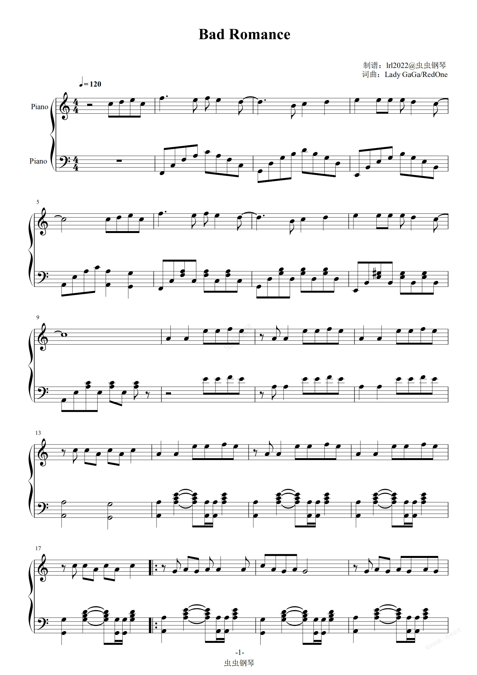 钢琴谱:Lady GaGa-罗曼死-Bad Romance-五线谱-简谱-钢琴谱