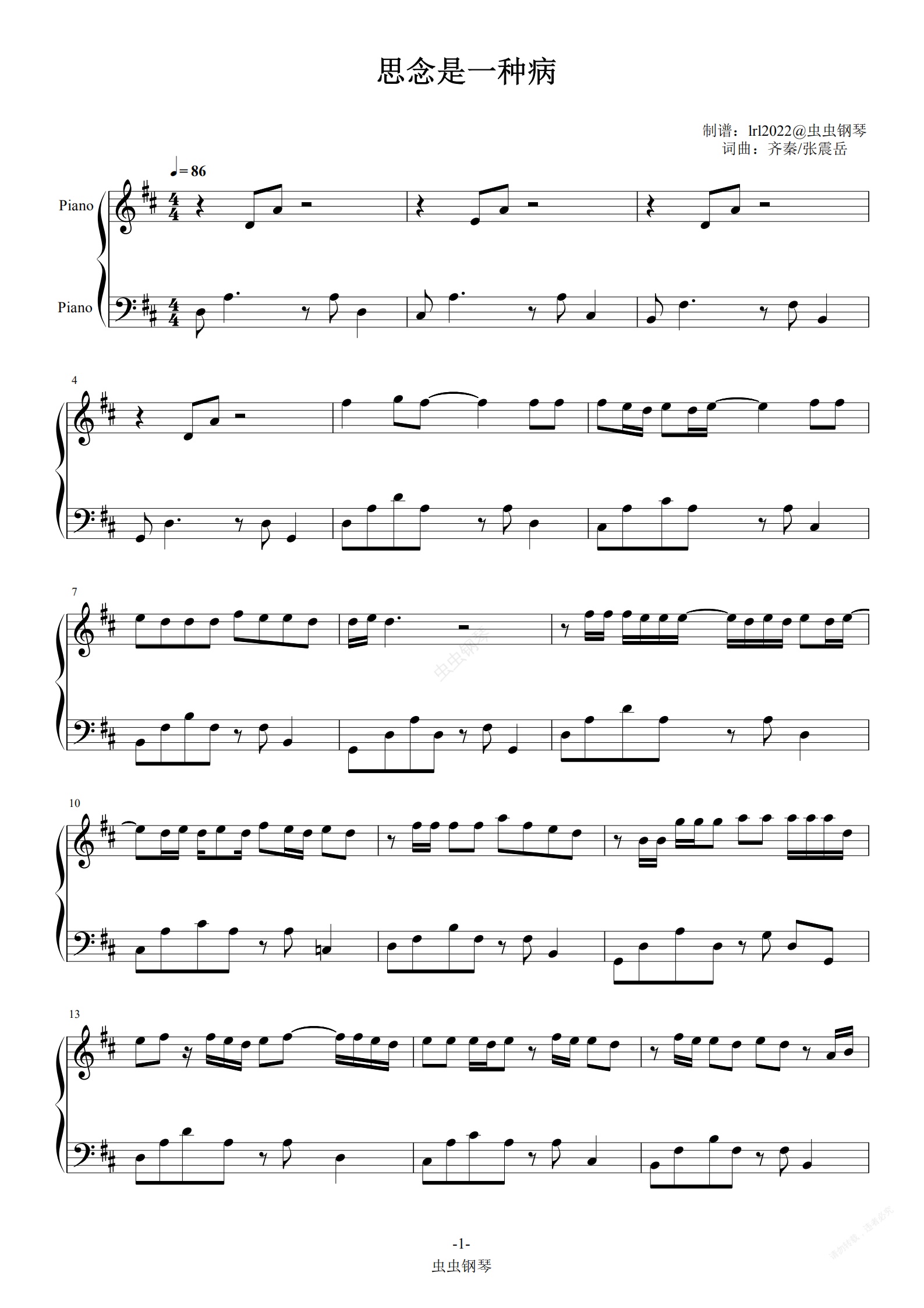 钢琴谱:思念是一种病-五线谱-简谱-钢琴谱