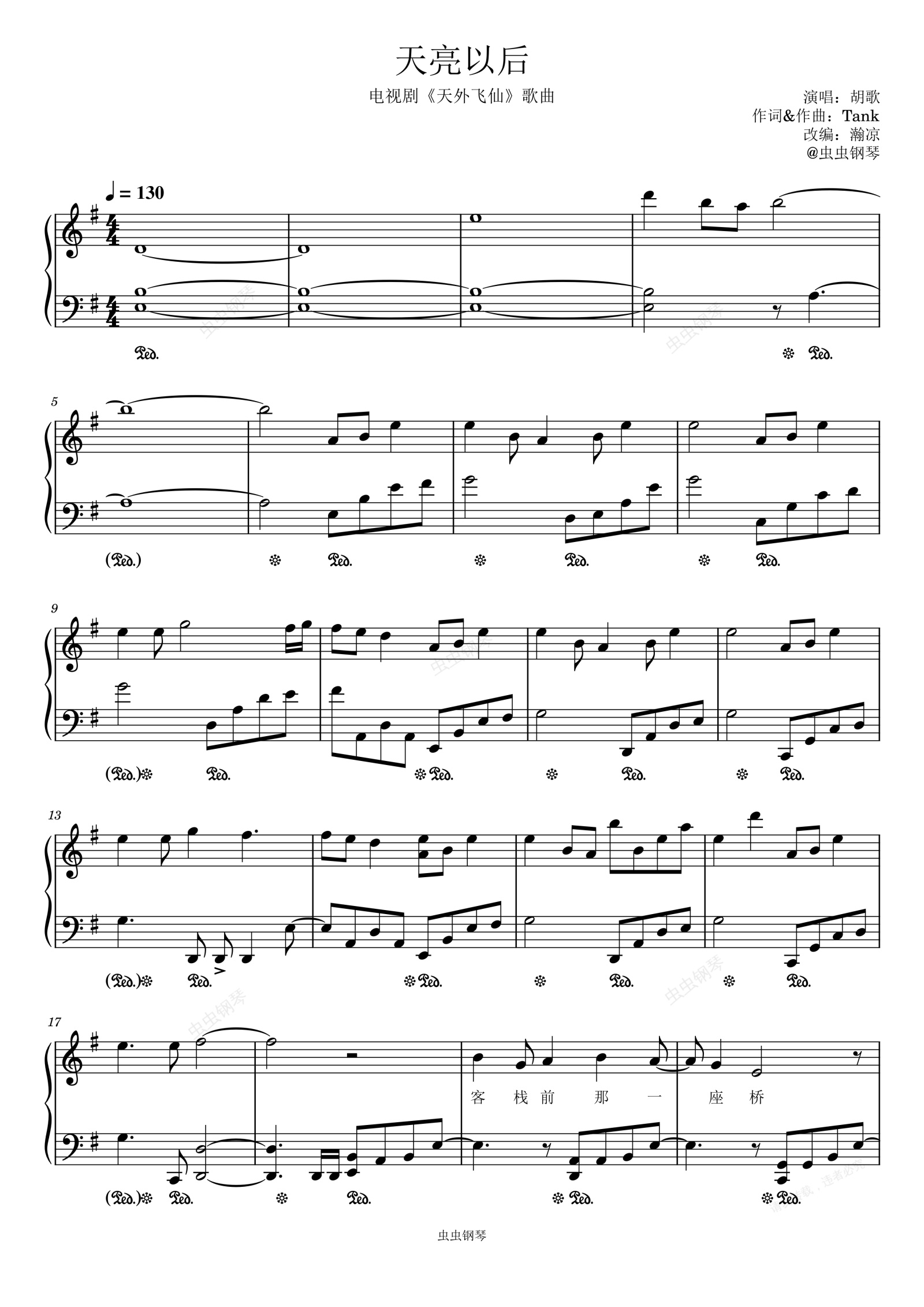 钢琴谱:天亮以后-胡歌 独奏谱