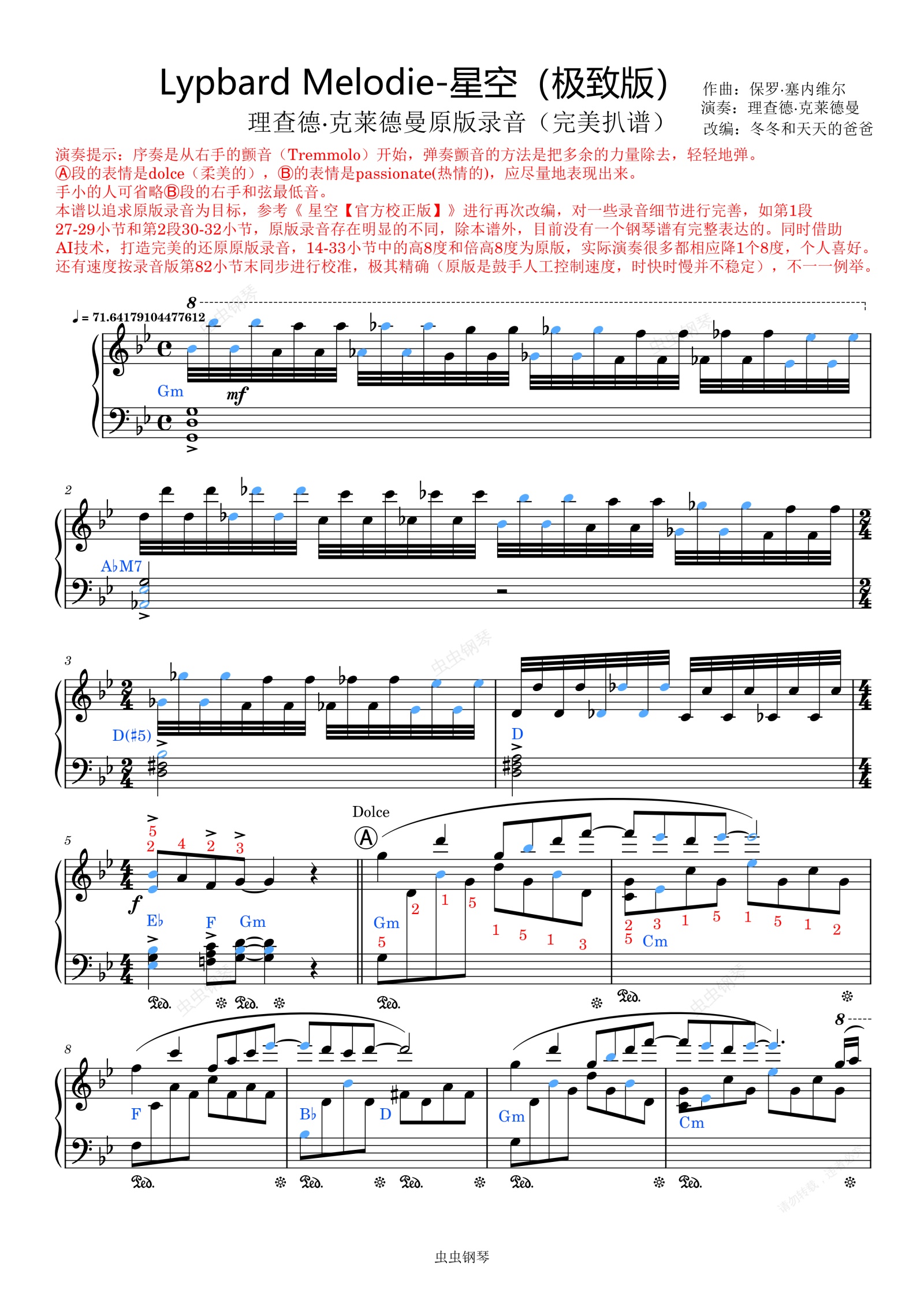 本谱参考《 星空【官方校正版】》进行再次改编,对一些录音细节进行完善,如第1段27-29小节和第2段30-32小节,原版录音存在明显的不同,除本谱外,目前没有一个钢琴谱有完整表达的。