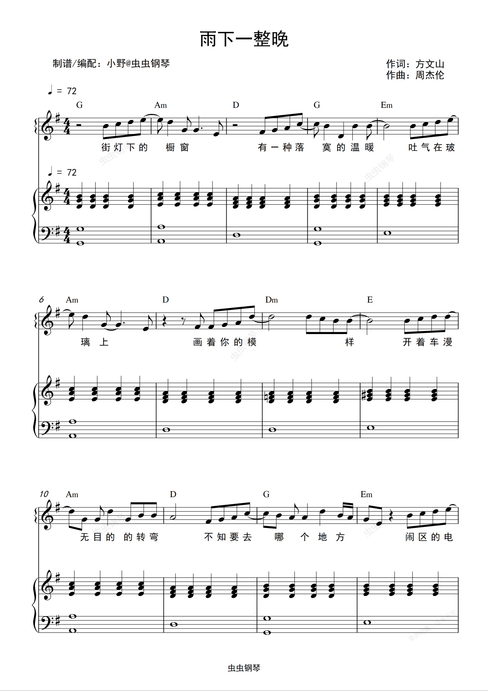 钢琴谱:雨下一整晚(和弦弹唱版)