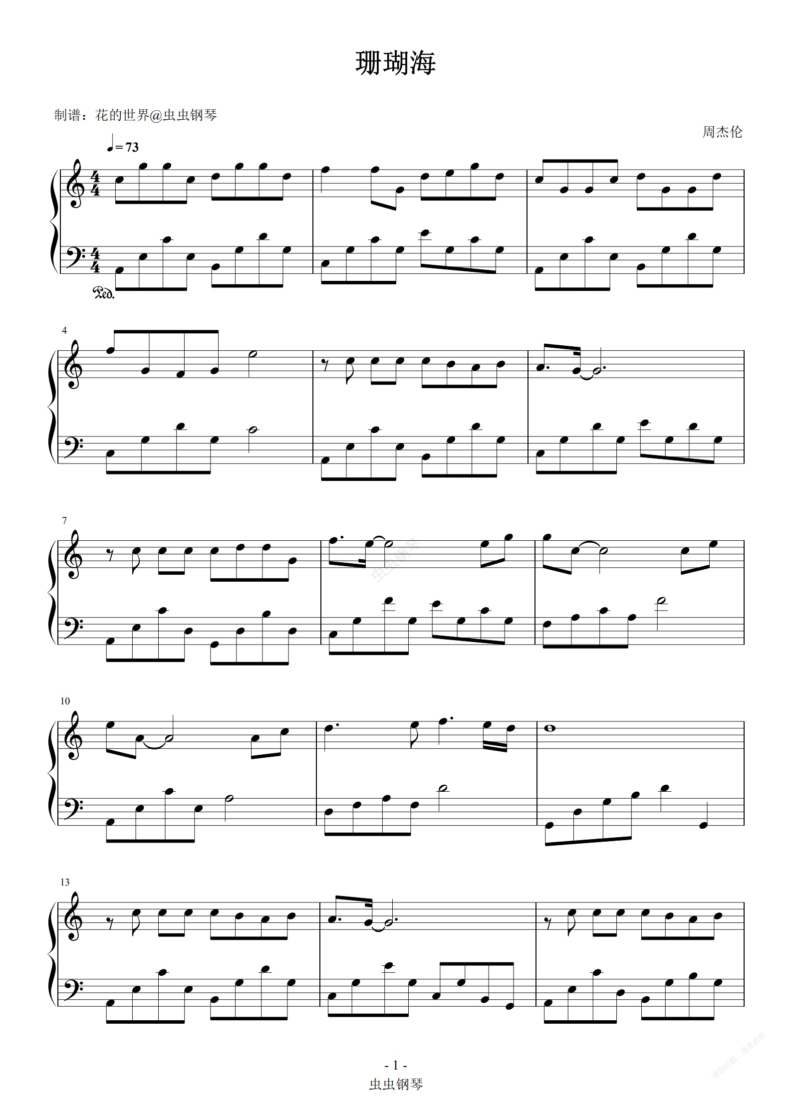 钢琴谱:珊瑚海 C调简易版 周杰伦、梁心颐