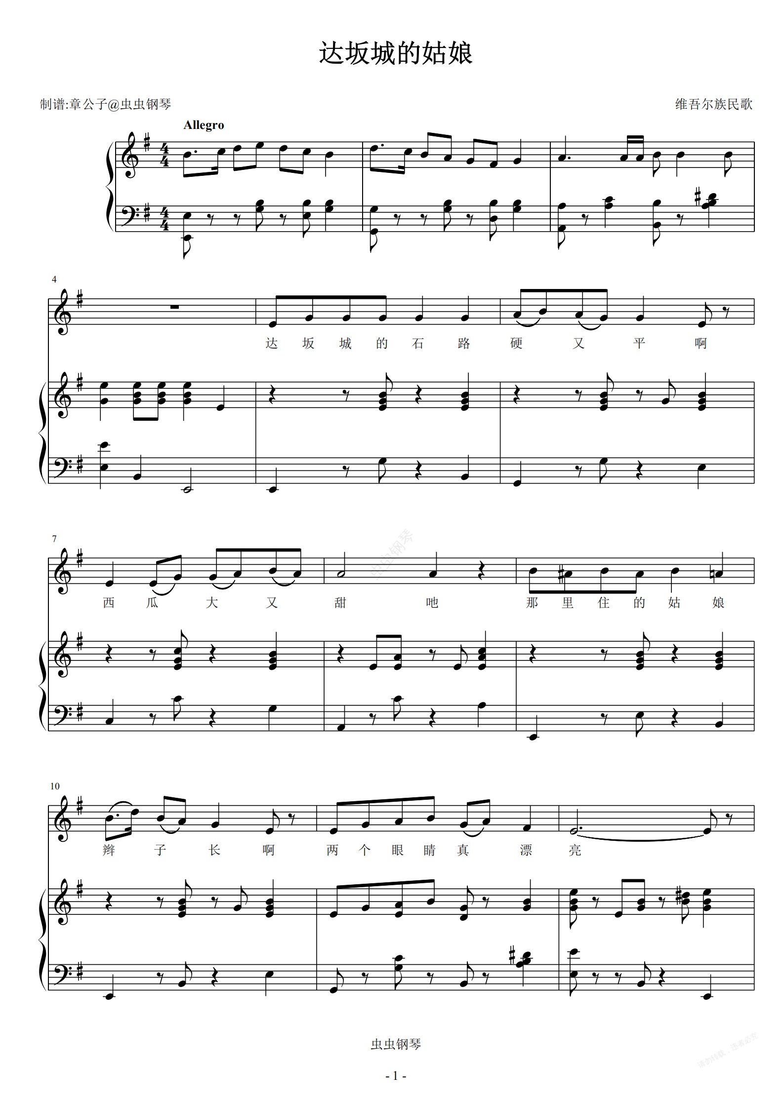 钢琴谱:达坂城的姑娘 钢琴弹唱(伴奏)谱 G转bA调