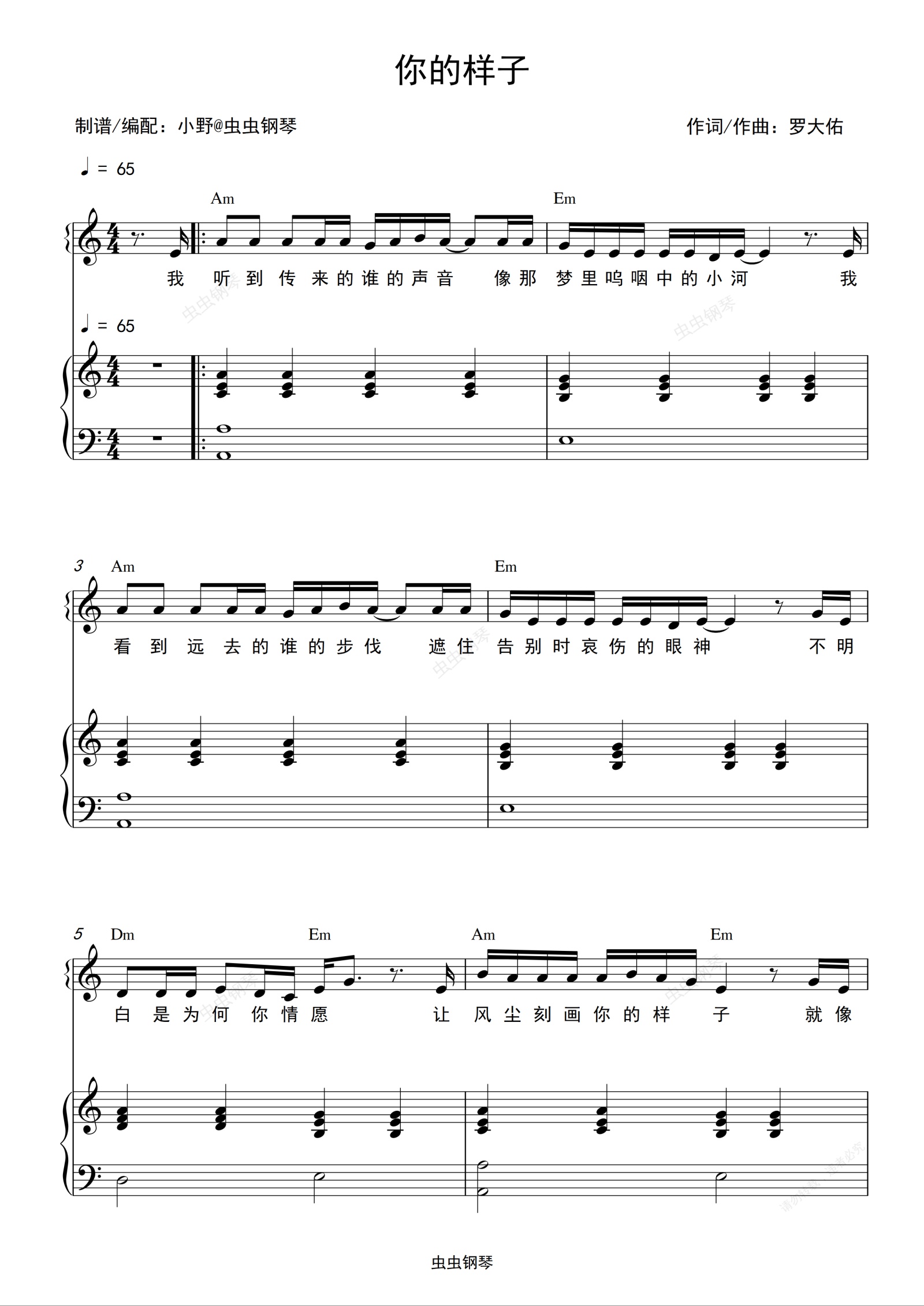 钢琴谱:你的样子(和弦弹唱版)