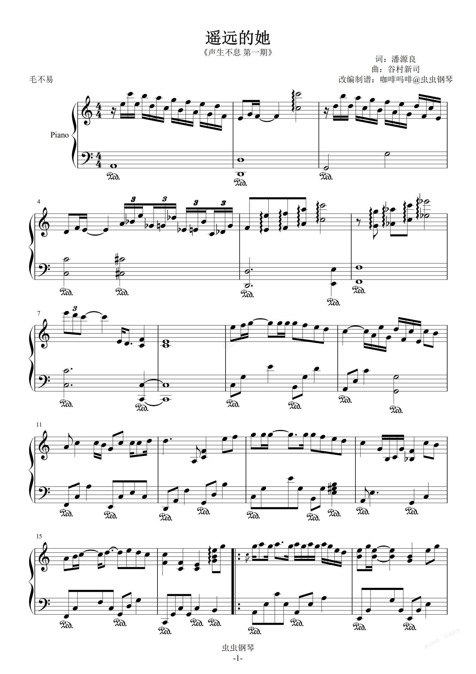 钢琴谱:遥远的她-毛不易 C调独奏谱