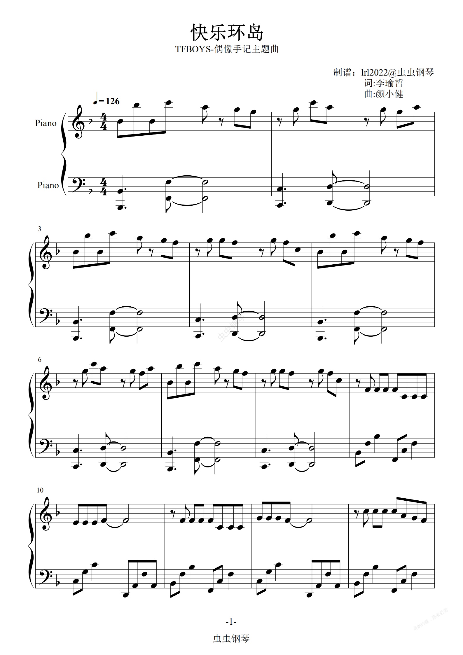 钢琴谱:快乐环岛-TFBOYS-偶像手记主题曲-五线谱-简谱-钢琴谱