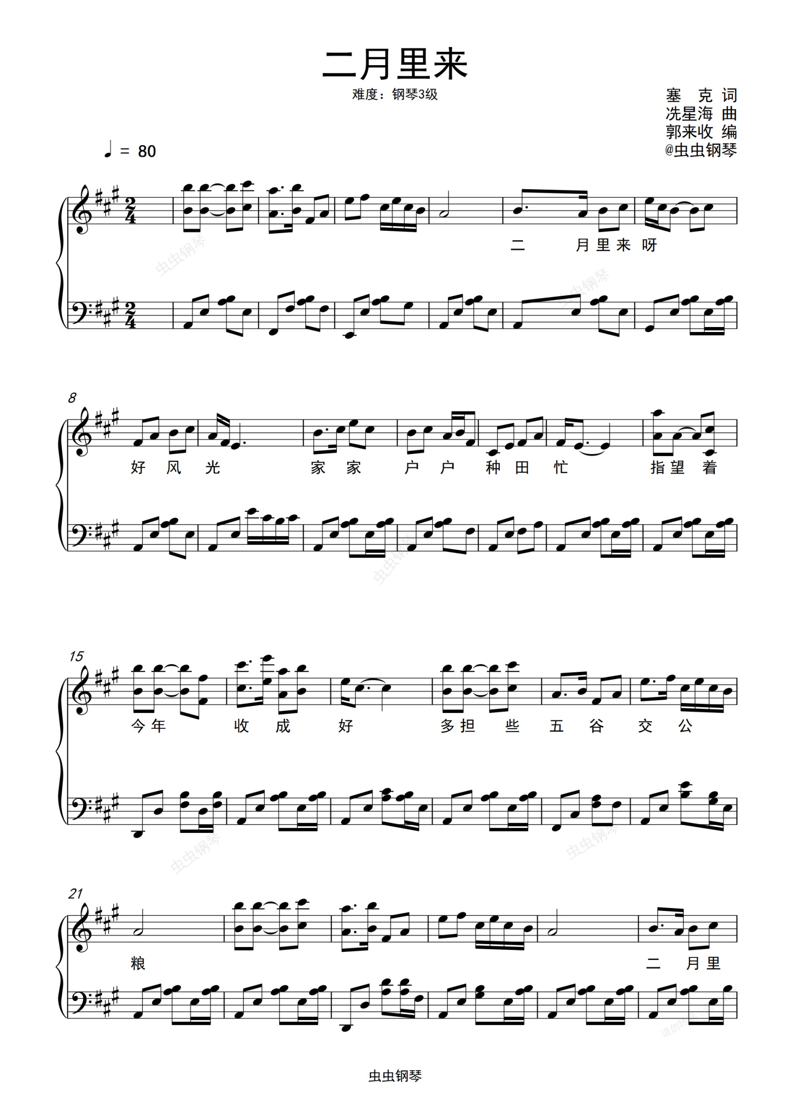 钢琴谱:声乐曲《二月里来》A调二声部钢琴即兴伴奏谱