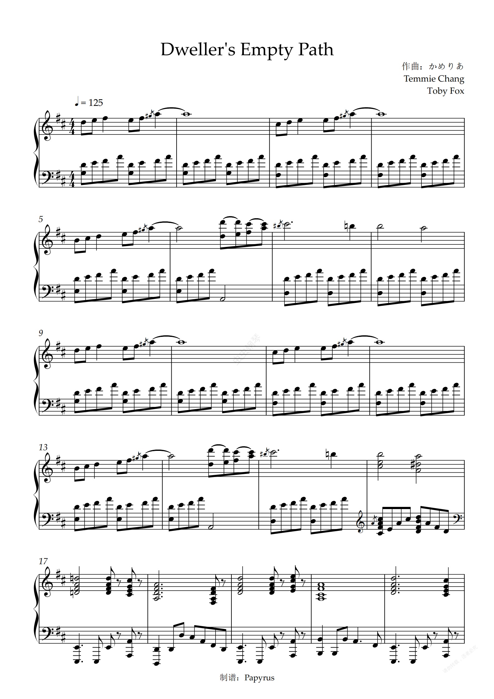 从油管(其实是B站)上扒下来再加以改编的作品。属于《空径之民》的游戏原声带。《空径之民》由《传说之下》及《三角符文》画师所做,她、Toby和山茶花创作了该游戏的音乐。该版本会略有难度(以我的能力来看是这样),因此做了一个简易版的,可以去看看。(原谱试听与该谱有一定出入,但并无大碍)