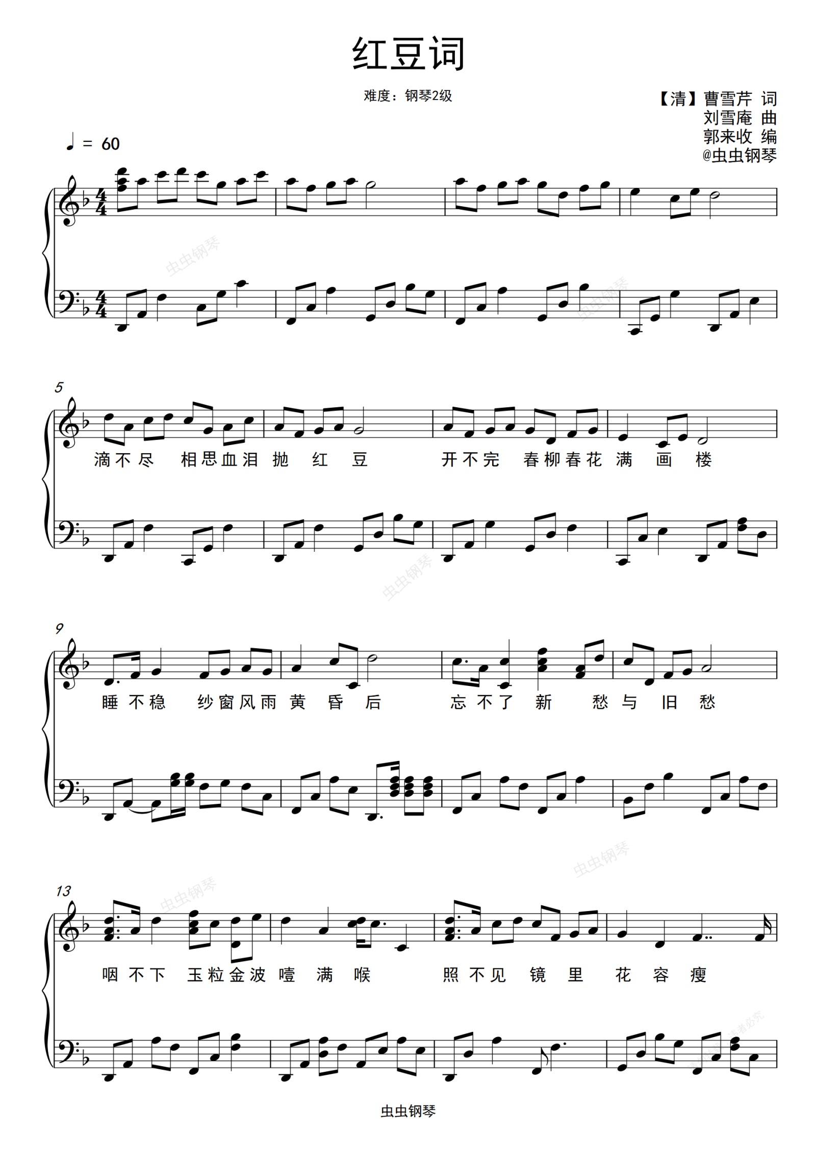 钢琴谱:声乐曲《红豆词》F调二声部钢琴即兴伴奏谱