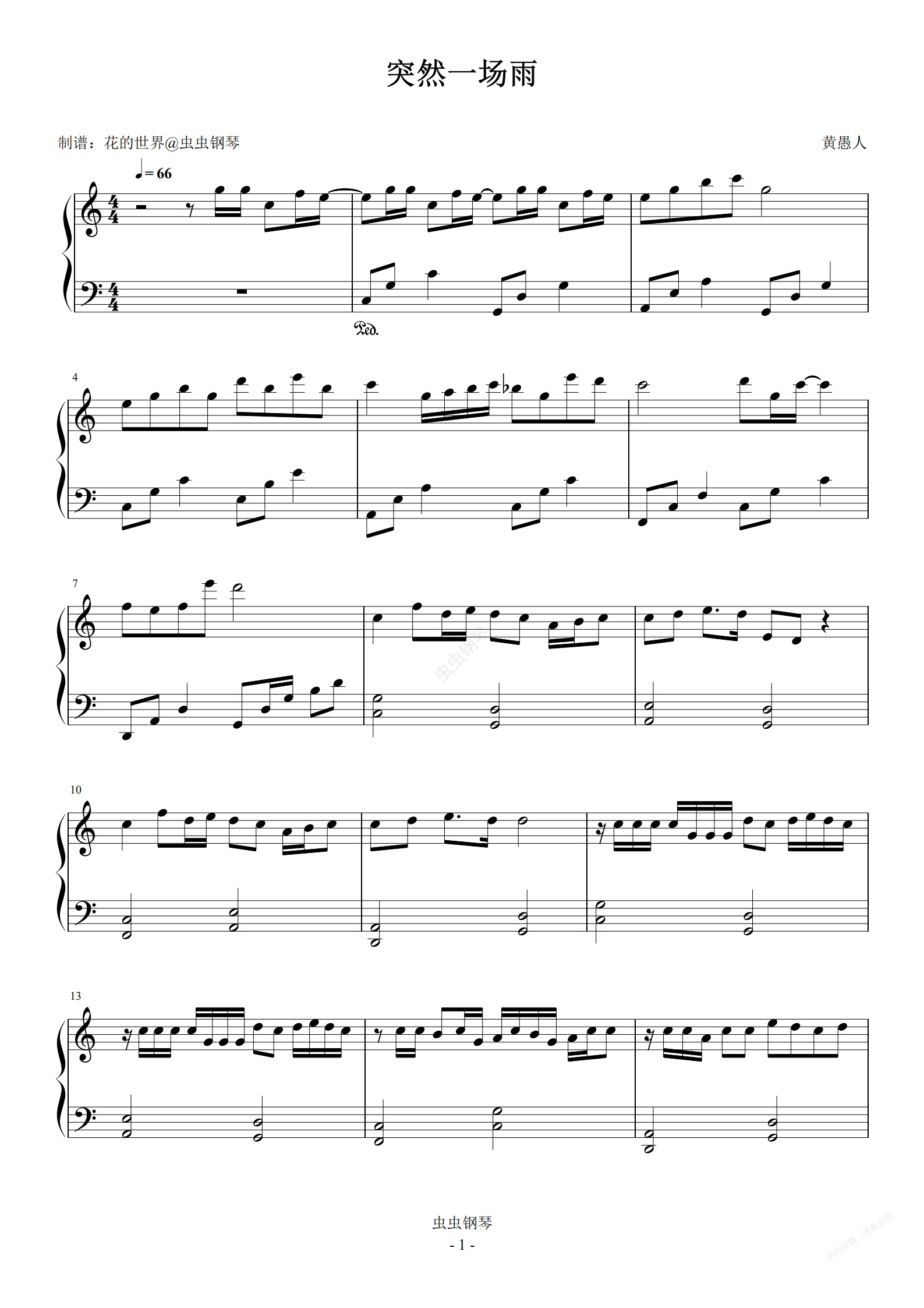 钢琴谱:突然一场雨 C调简易版  蓝心羽