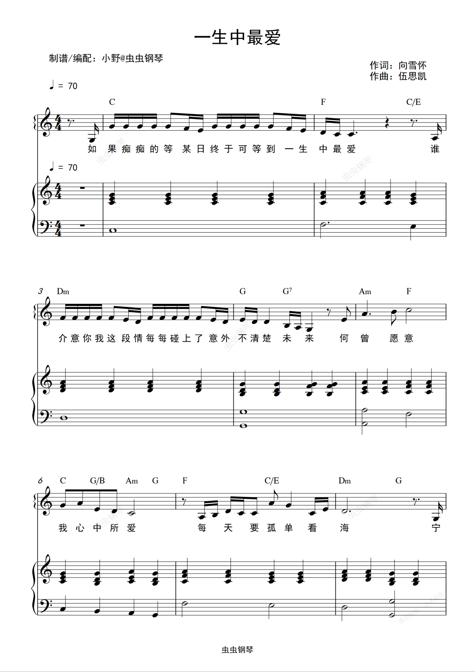 钢琴谱:一生中最爱(和弦弹唱版)