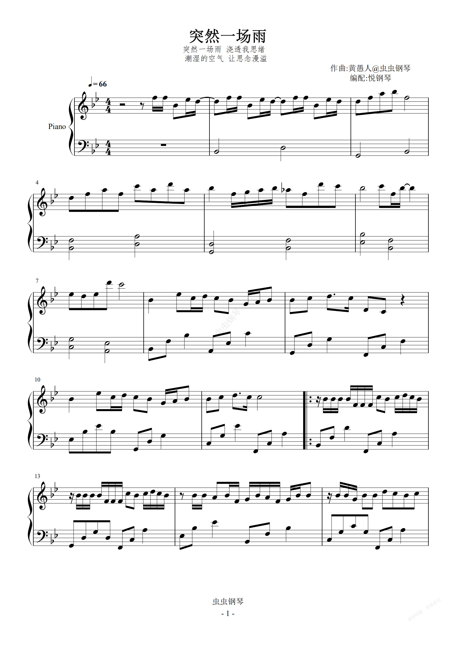 钢琴谱:突然一场雨(原调版) 蓝心羽
