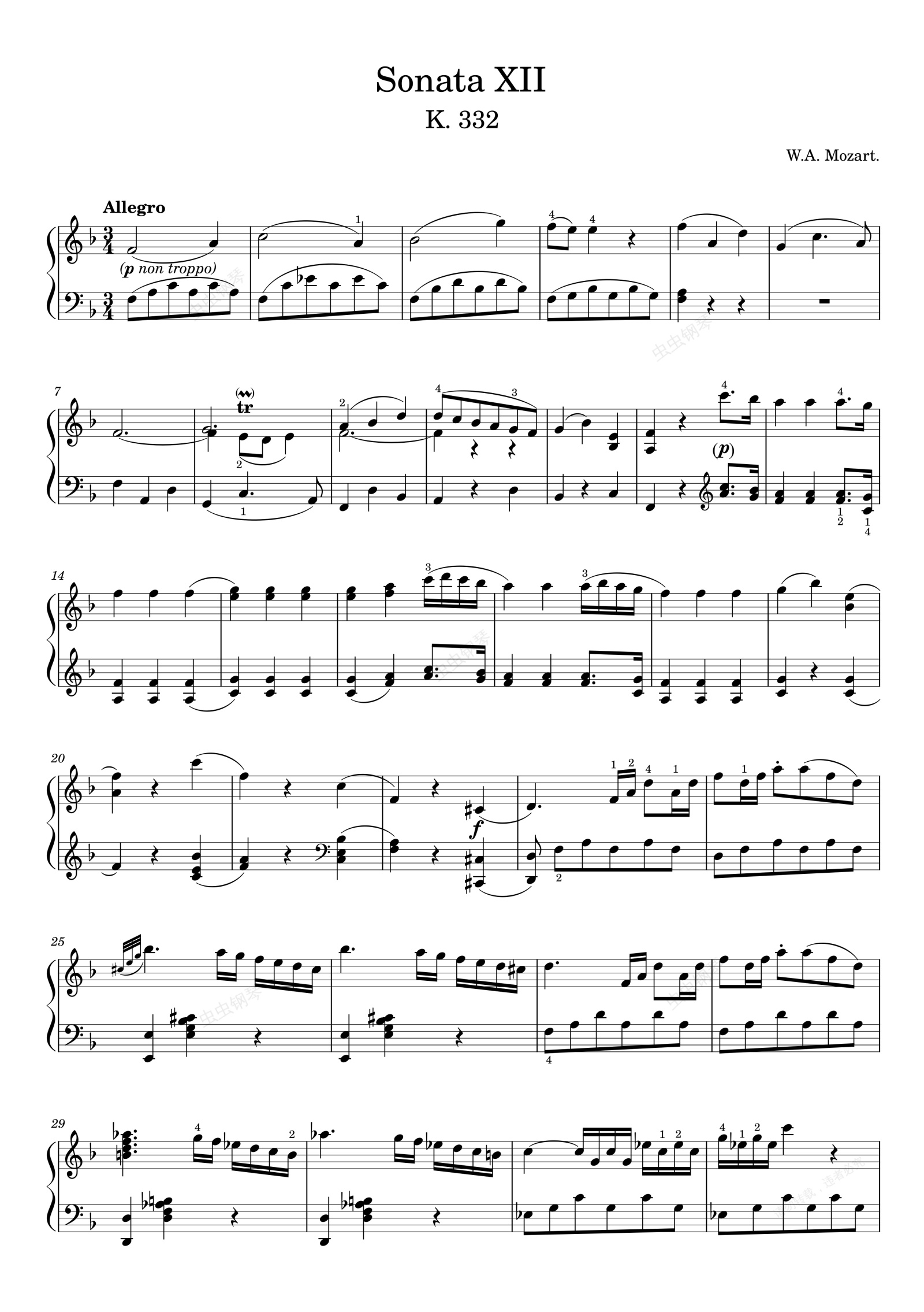 钢琴谱:莫扎特第十二钢琴奏鸣曲 Sonata No. 12, 1st Movement K. 332