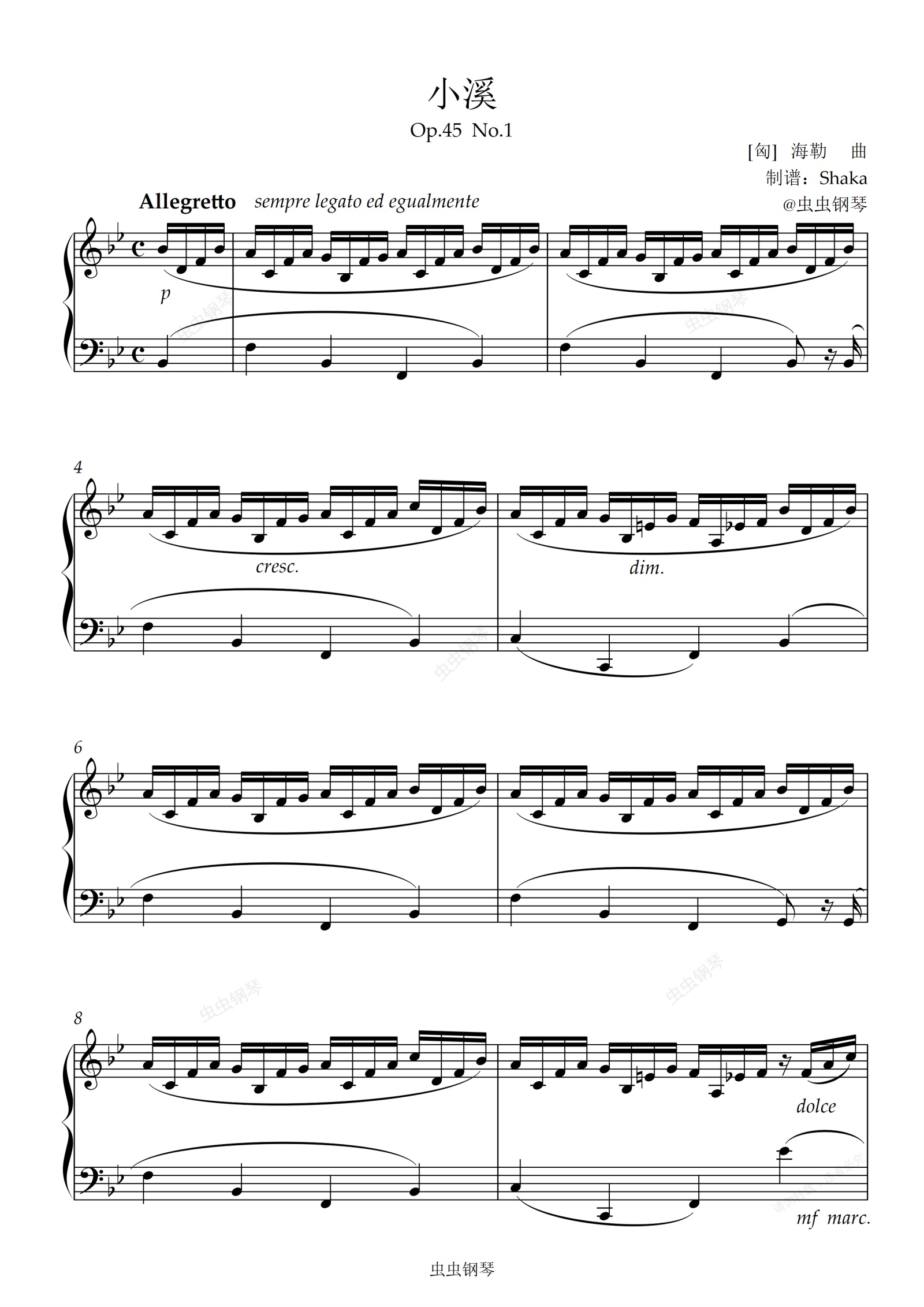 钢琴谱:小溪 Op.45 No.1 降B调版 全国音协4级A-3考级曲目