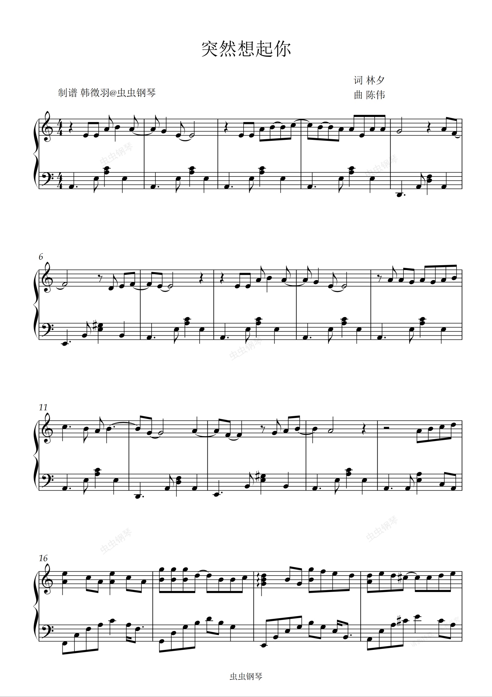 钢琴谱:突然想起你 萧亚轩 简单易弹