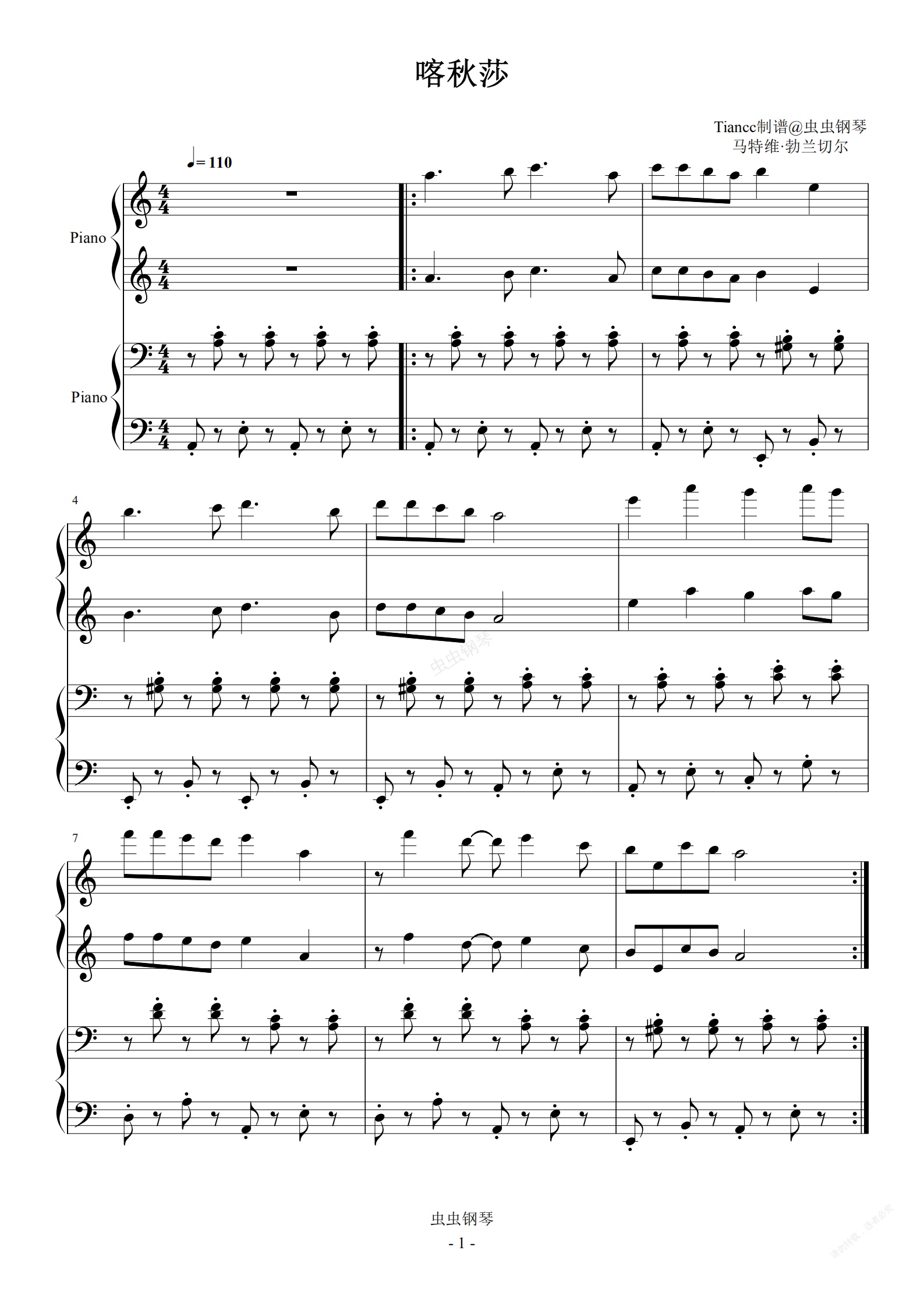 钢琴谱:《喀秋莎》四手联弹,启蒙教学专用
