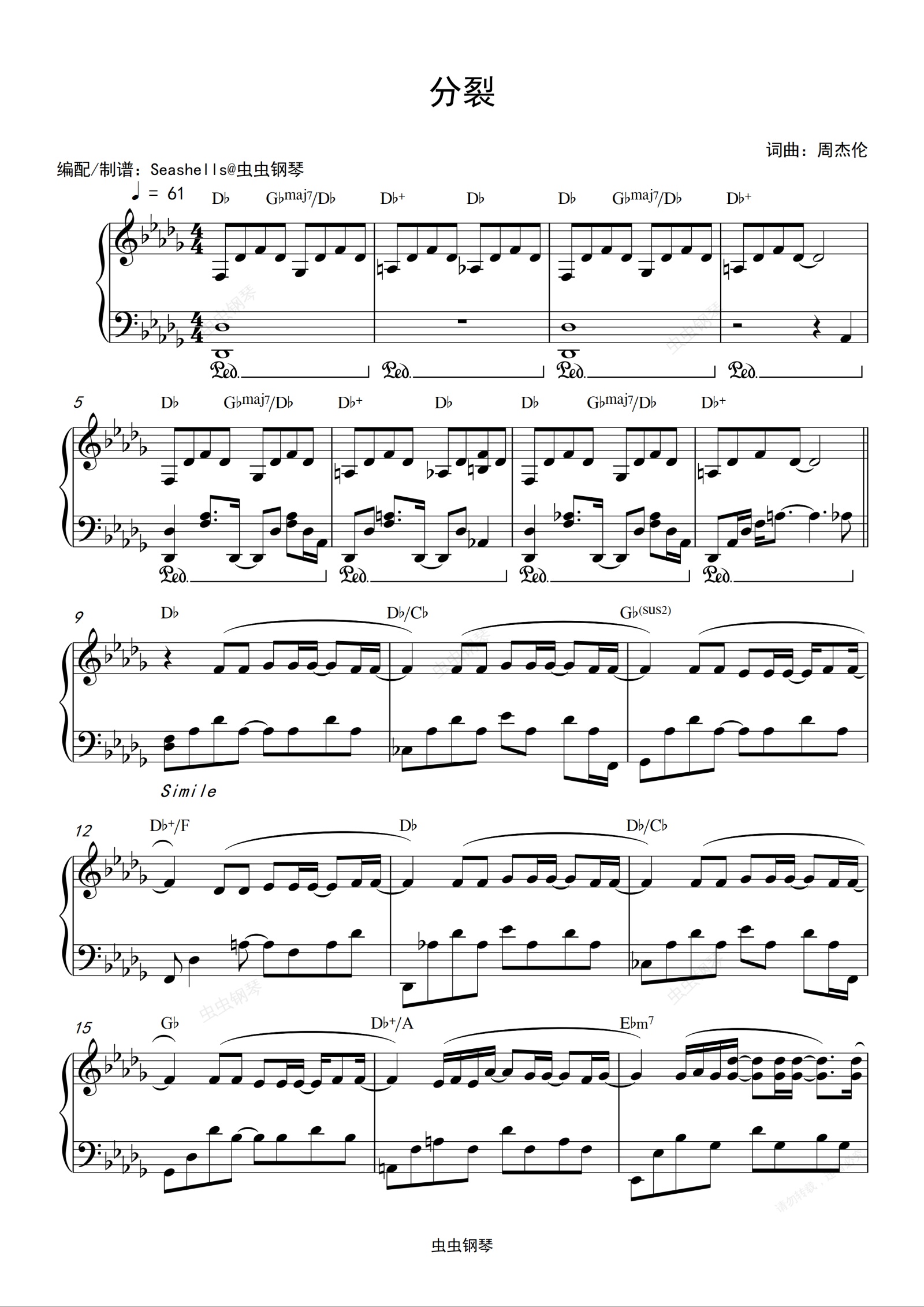 钢琴谱:周杰伦-《分裂》降D调 精编钢琴独奏