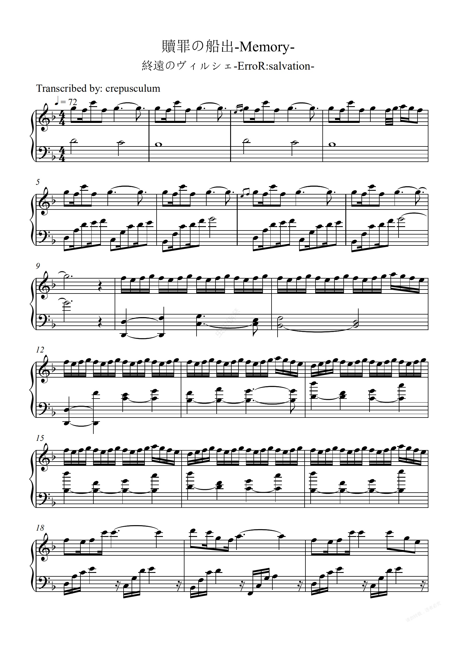 钢琴谱:【钢琴谱】贖罪の船出-Memory- 「終遠のヴィルシェ-ErroR:salvation-」