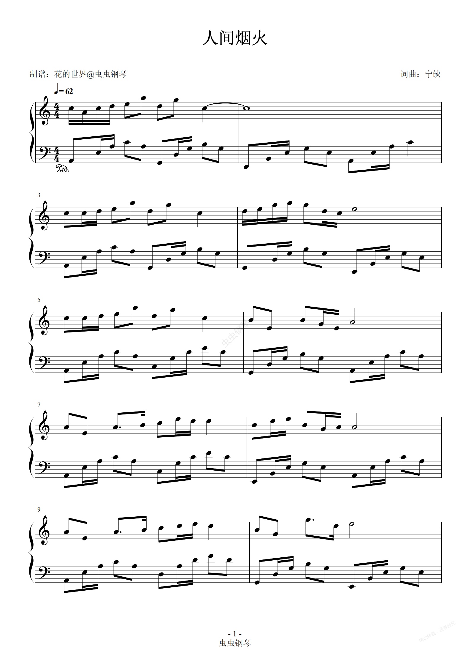 钢琴谱:人间烟火 C调简易版 程响
