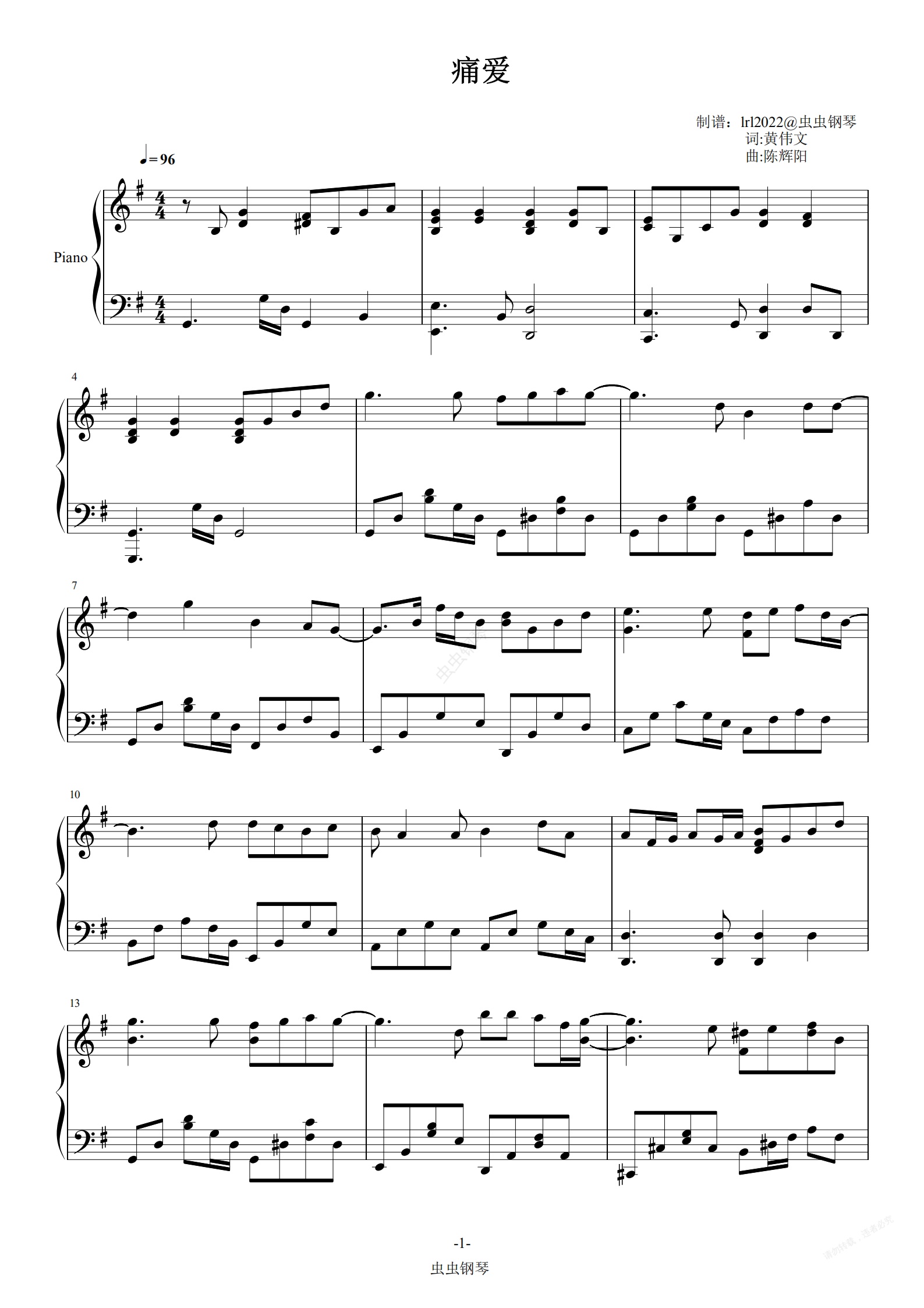 钢琴谱:痛爱-容祖儿-独奏版-钢琴谱