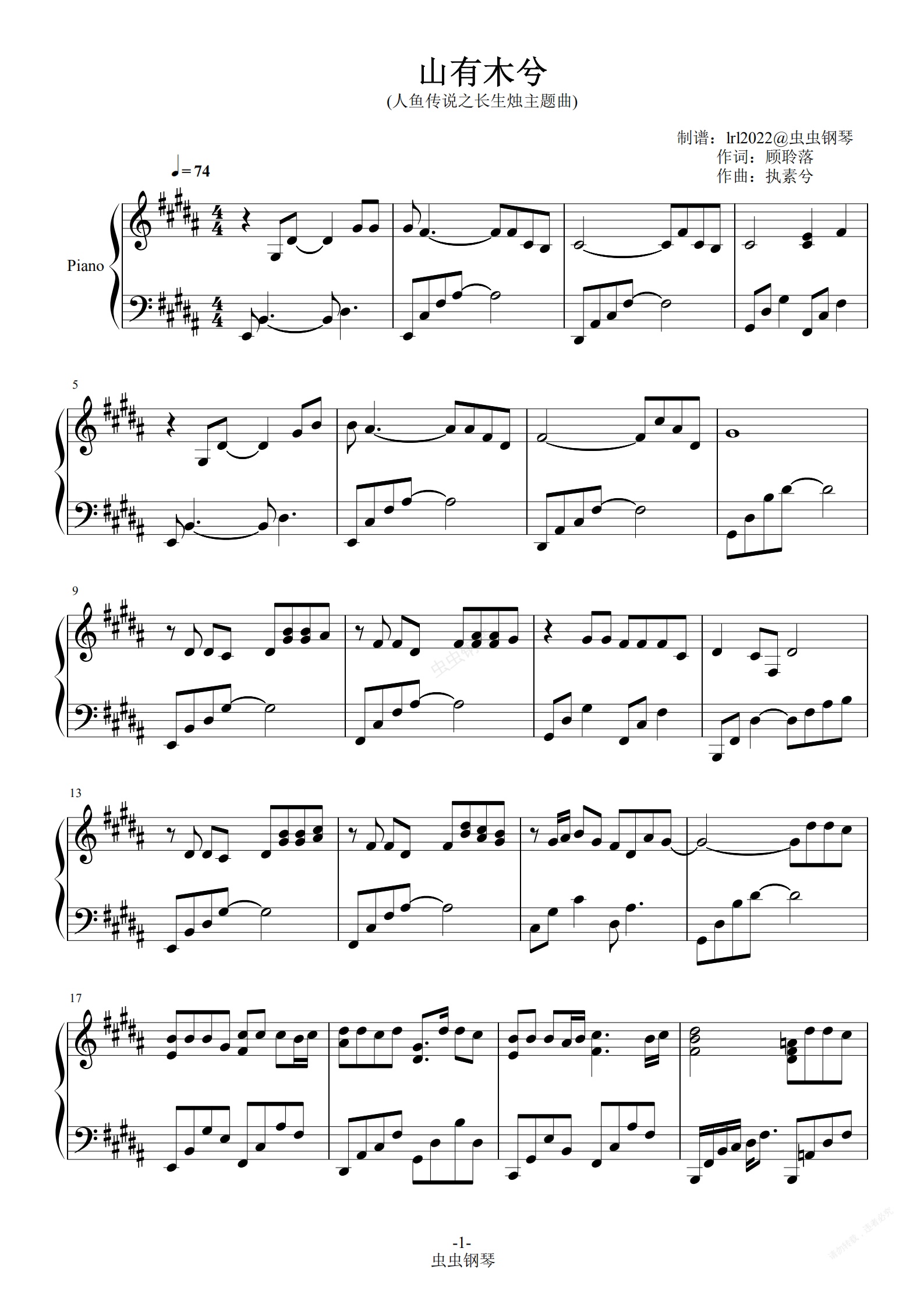 钢琴谱:山有木兮-人鱼传说之长生烛主题曲-独奏版-钢琴谱