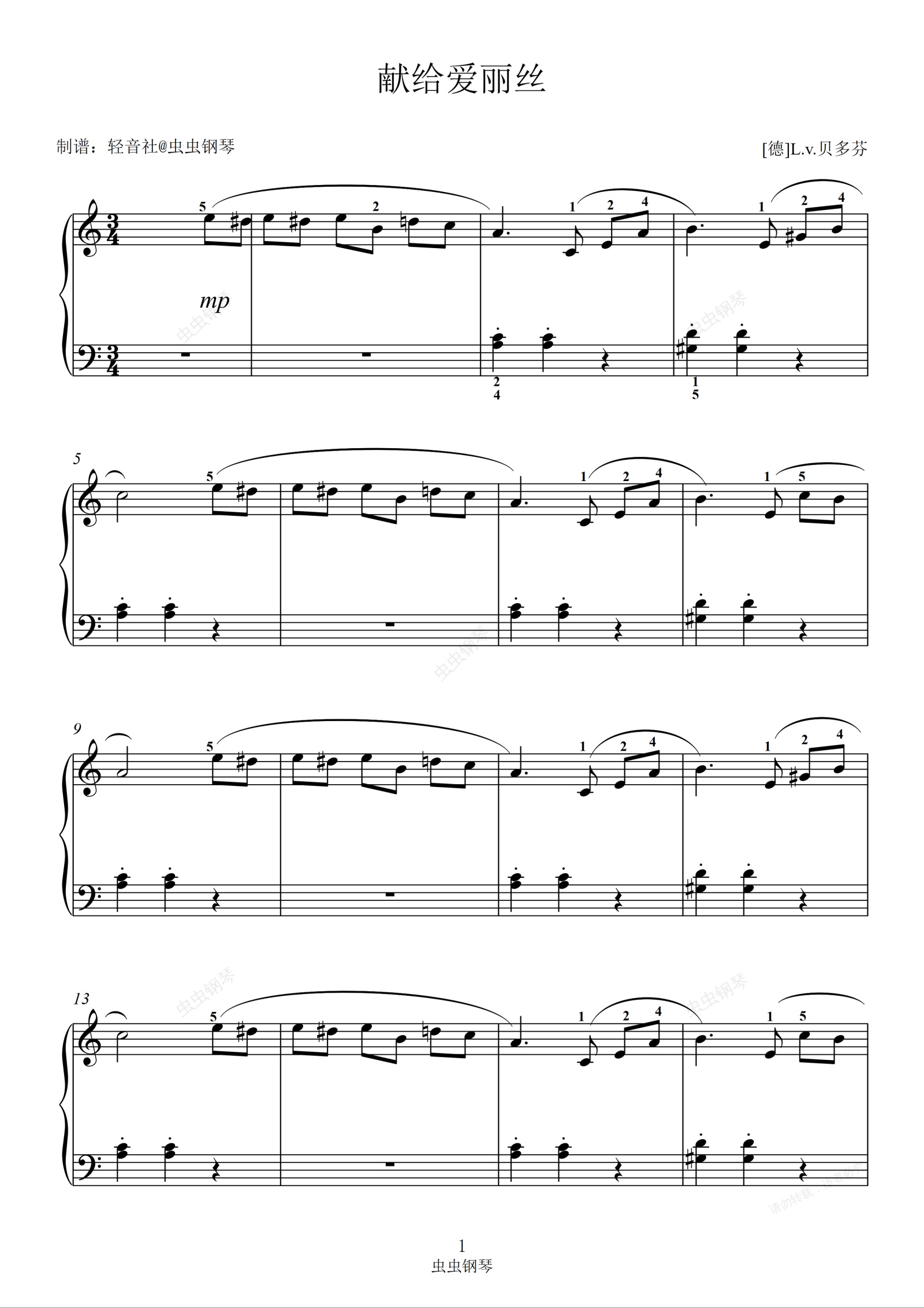 钢琴谱:《献给爱丽丝》《致爱丽丝》经典简易好弹初学儿童带指法
