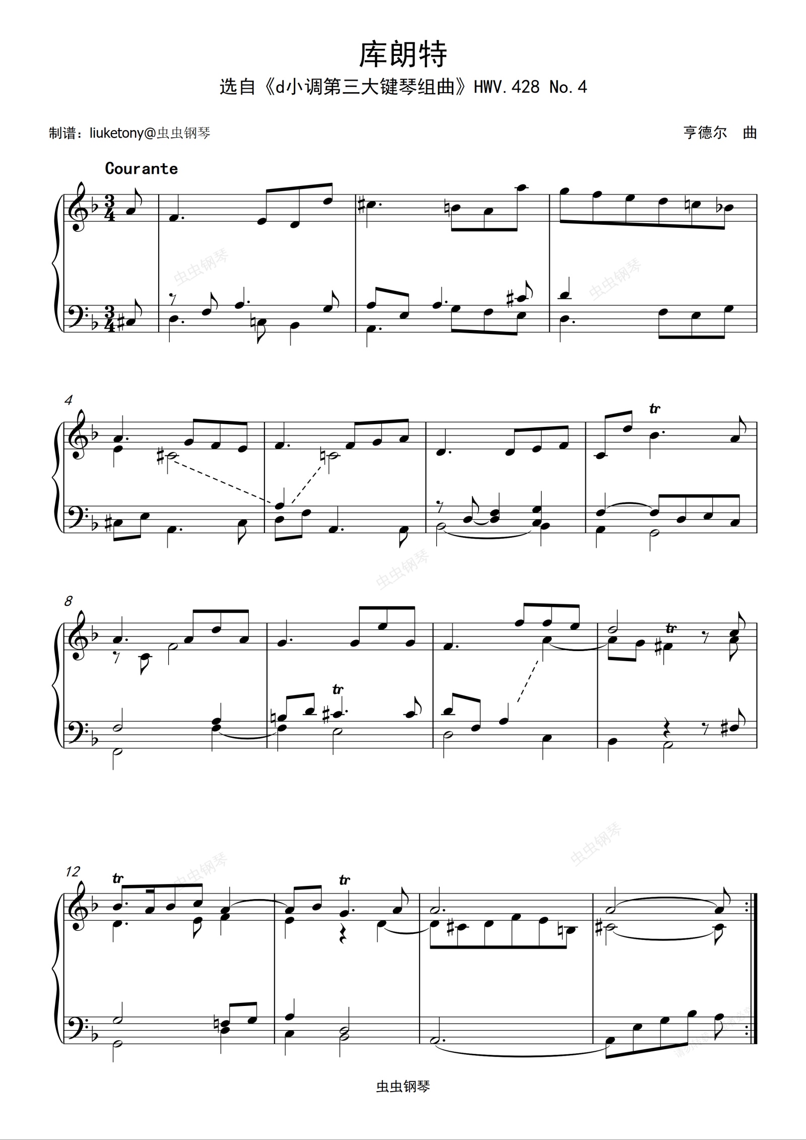 钢琴谱:7级-复调乐曲-库朗特HWV.428 No.4 (亨德尔)
