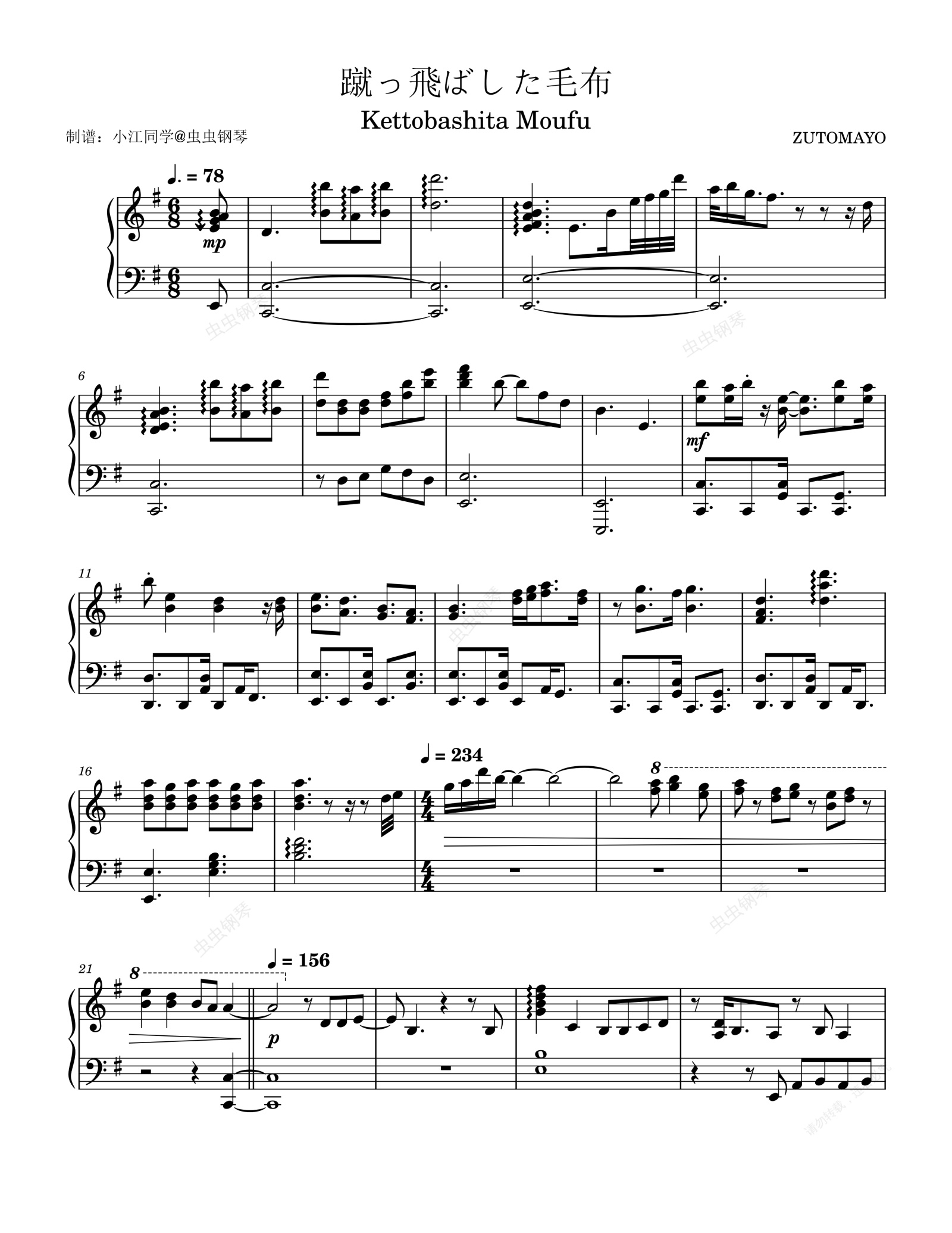 钢琴谱:蹴っ飛ばした毛布 Kettobashita Moufu
