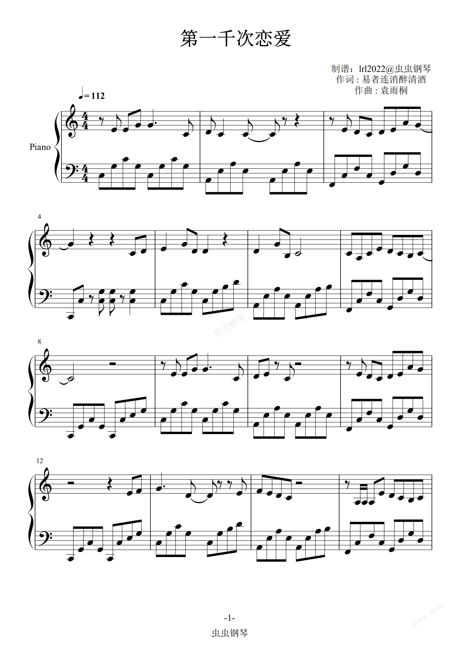 钢琴谱:第一千次恋爱-C调简单版-李蚊香-独奏版-钢琴谱
