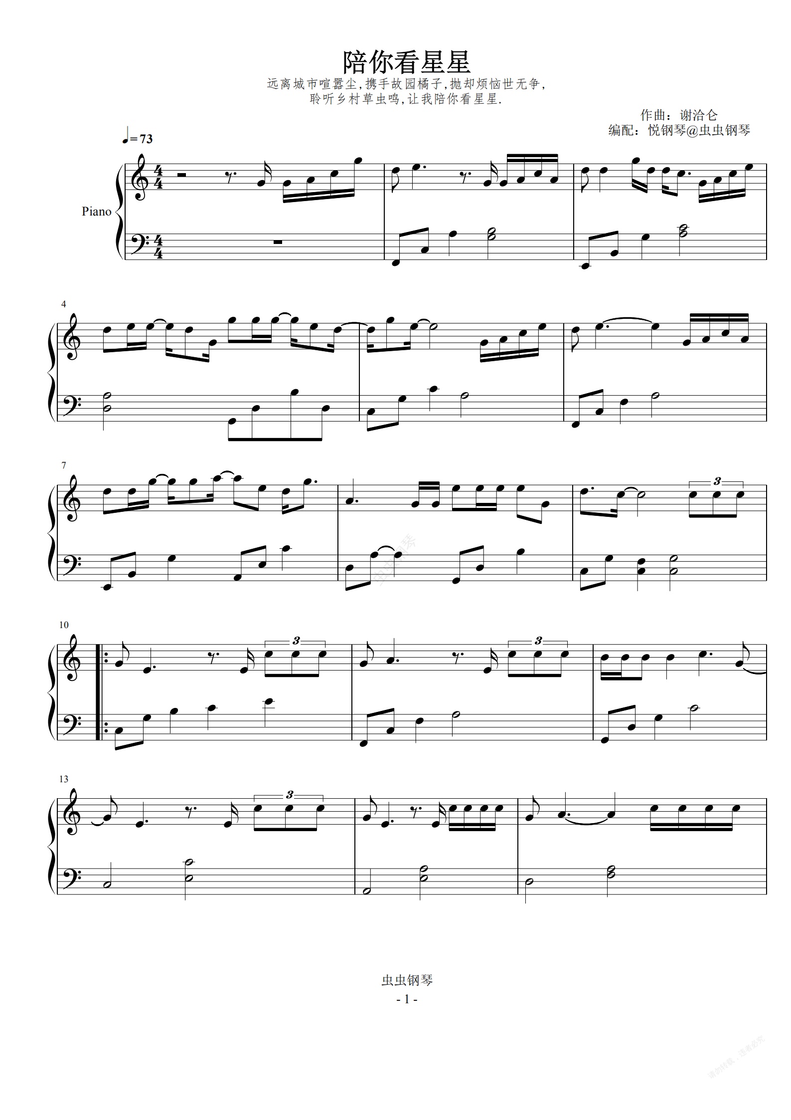 钢琴谱:陪你看星星 (c调版)陈子晴