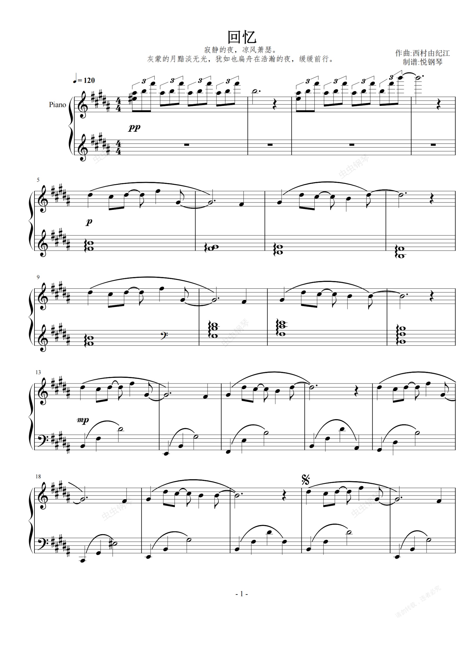 钢琴谱:回忆 (官方原版)治愈系 西村由纪江