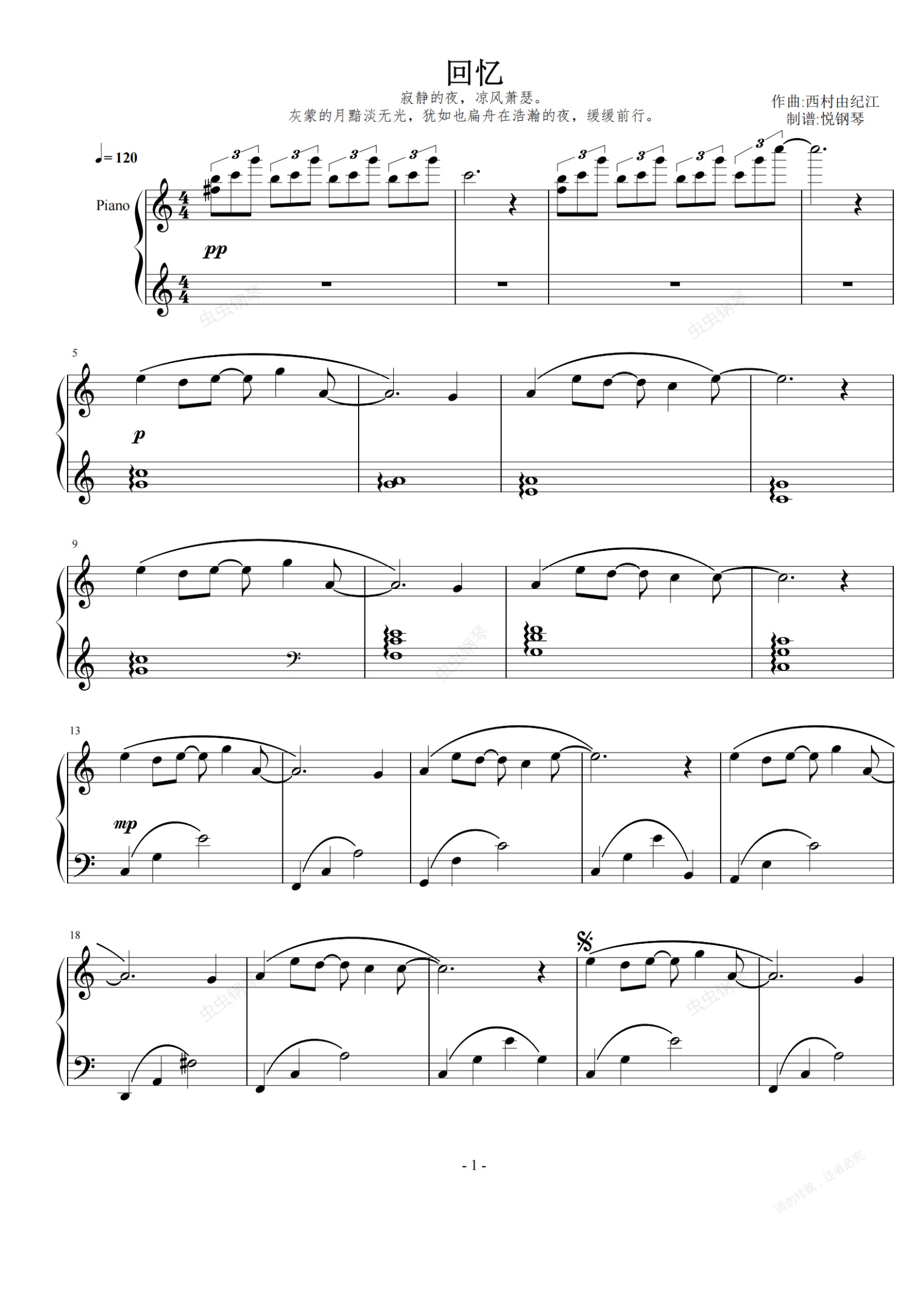 钢琴谱:回忆 (原版谱面移高半音)治愈系 西村由纪江