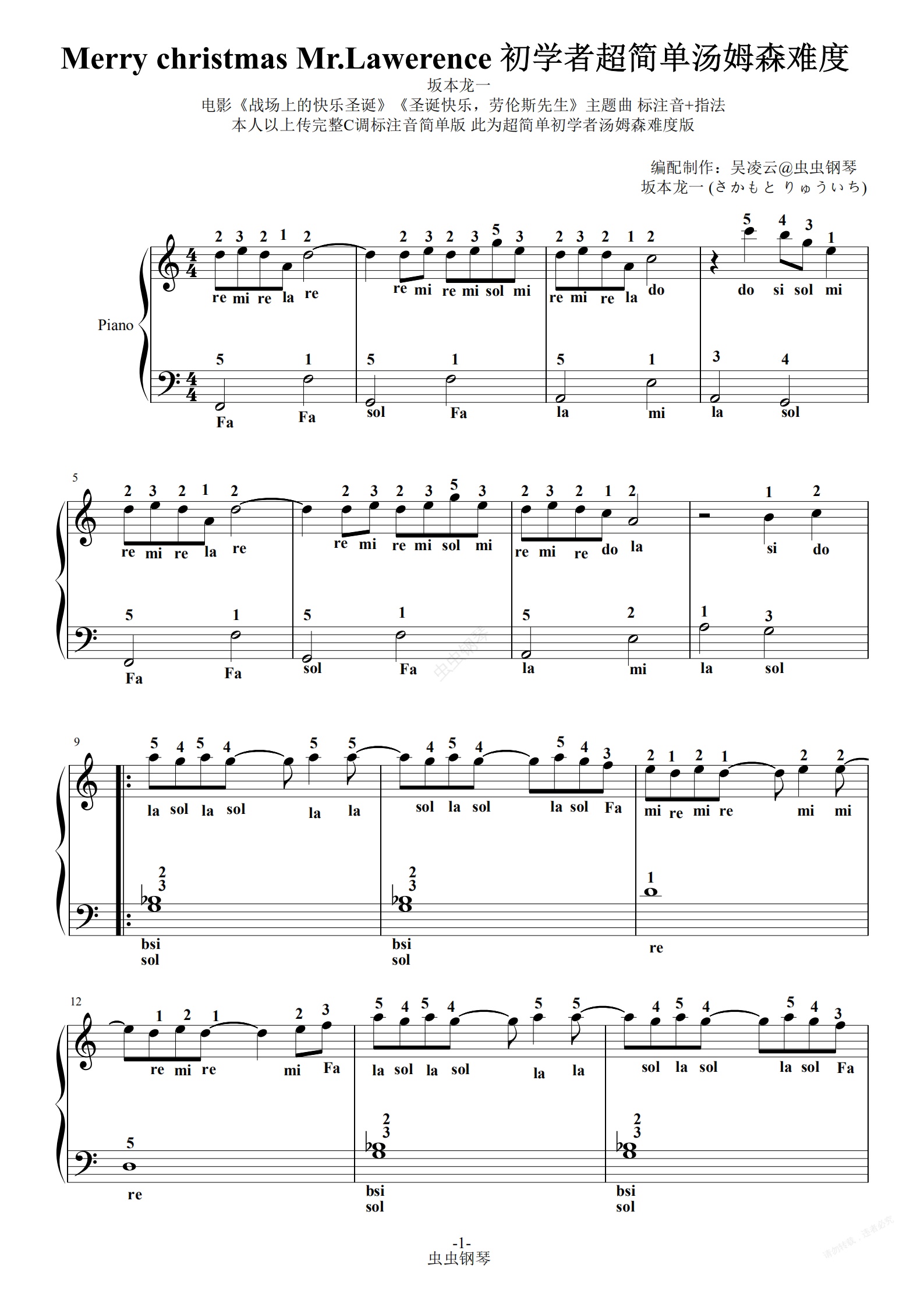 钢琴谱:Merry christmas Mr.Lawerence 初学者超简单汤姆森难度 《战场上的快乐圣诞》《圣诞快乐,劳伦斯先生》主题曲 标注音+指法