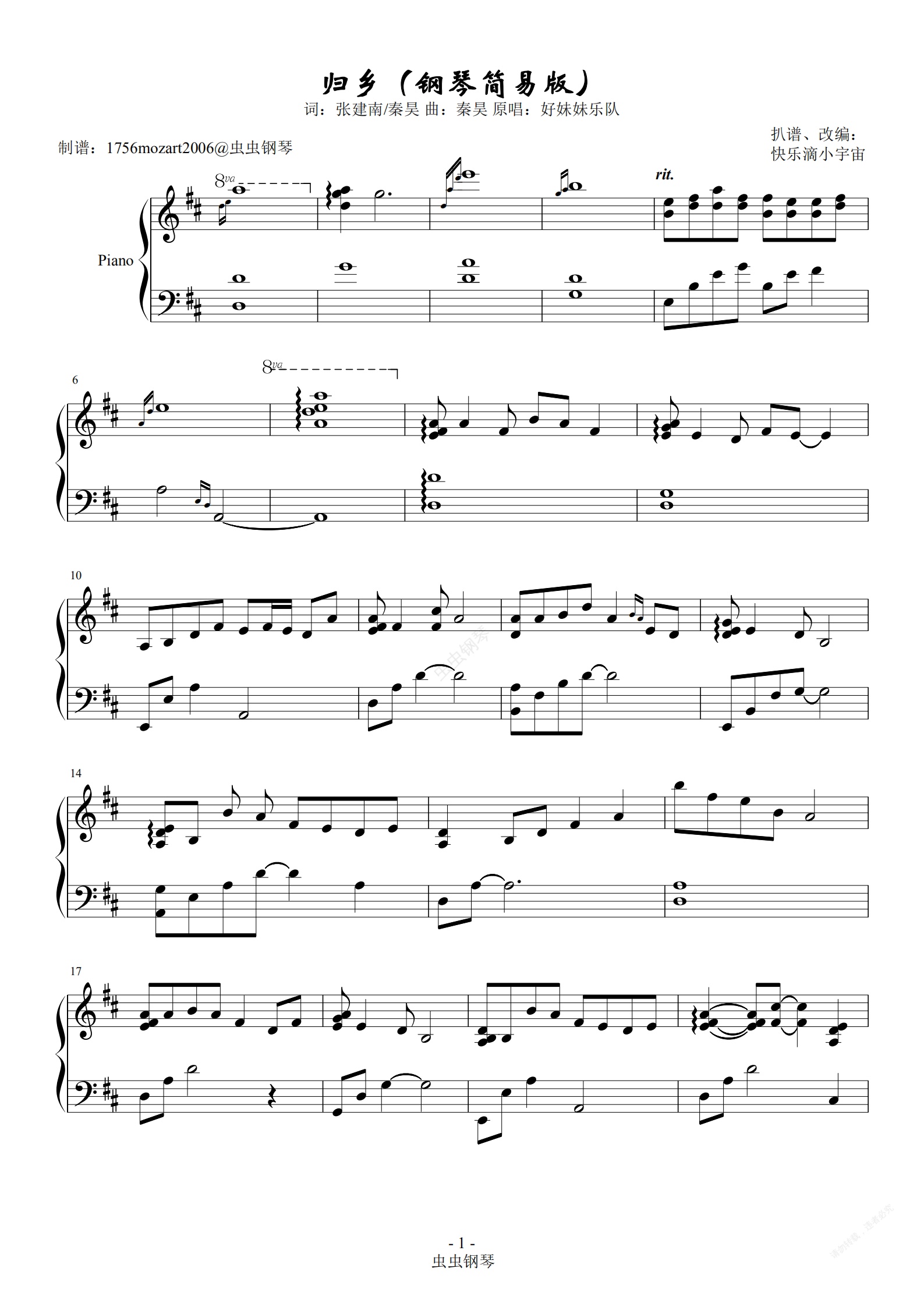 钢琴谱:归乡(钢琴简洁版)-好妹妹乐队