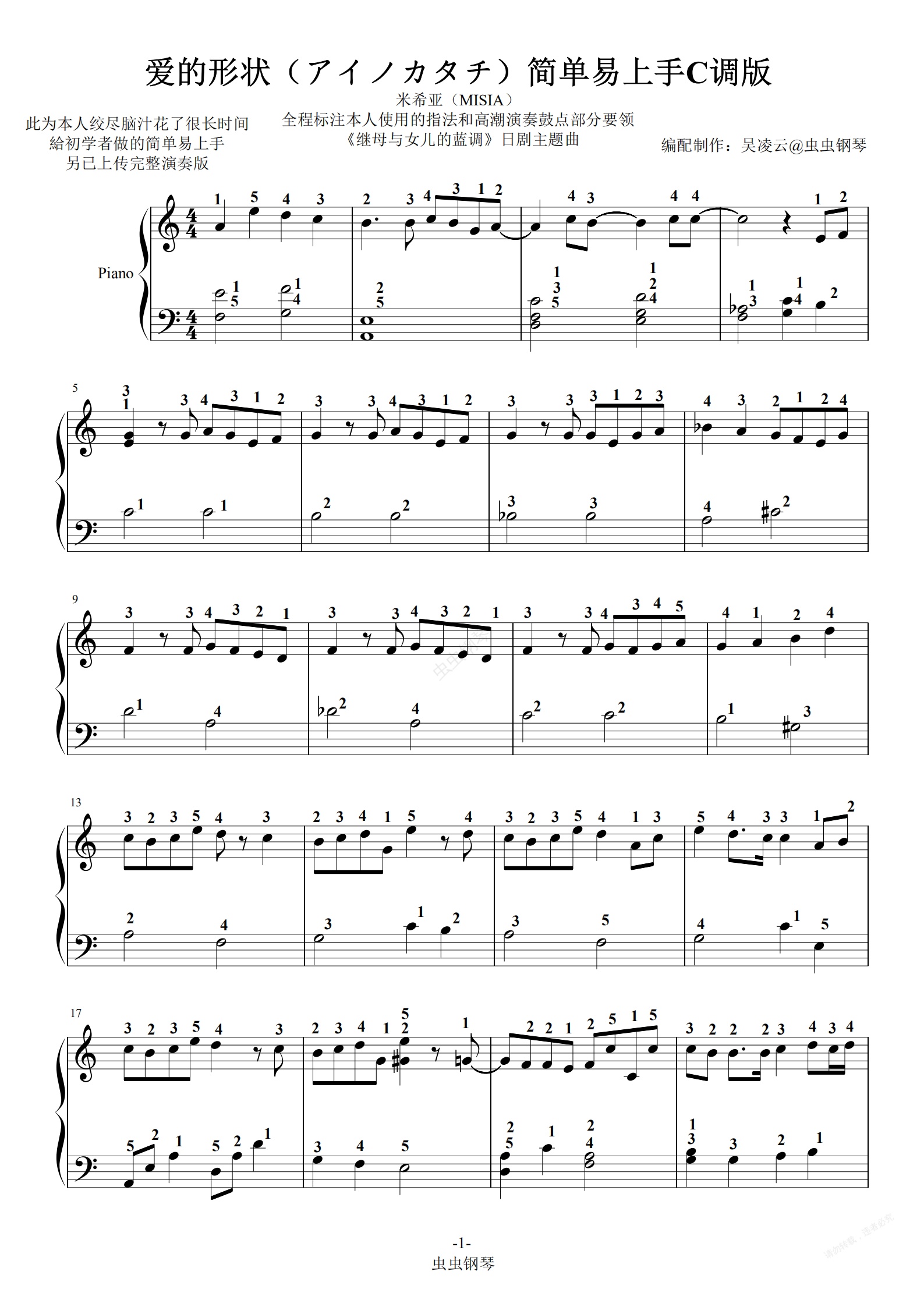 钢琴谱:爱的形状(アイノカタチ)简单易上手C调全程指法版 米希亚(MISIA)《继母与女儿的蓝调》日剧主题曲 吴凌云制