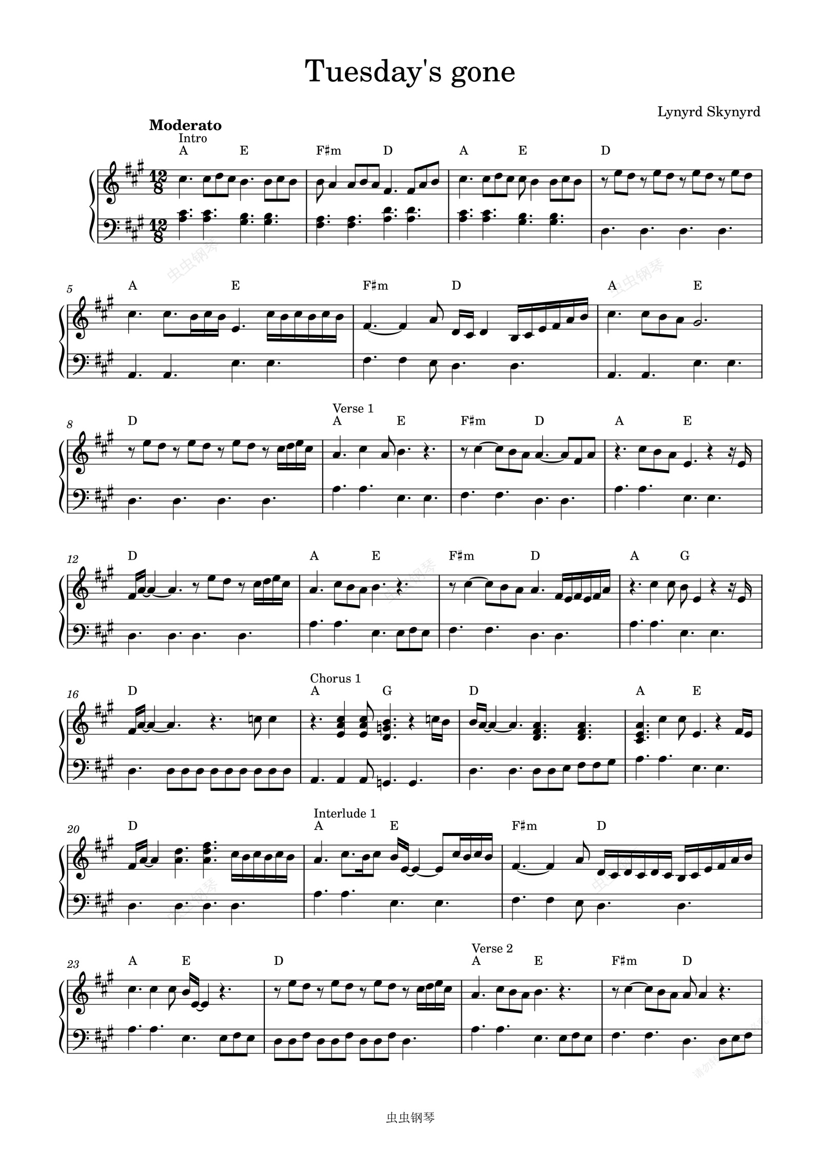钢琴谱:Tuesday's gone-Lynyrd Skynyrd