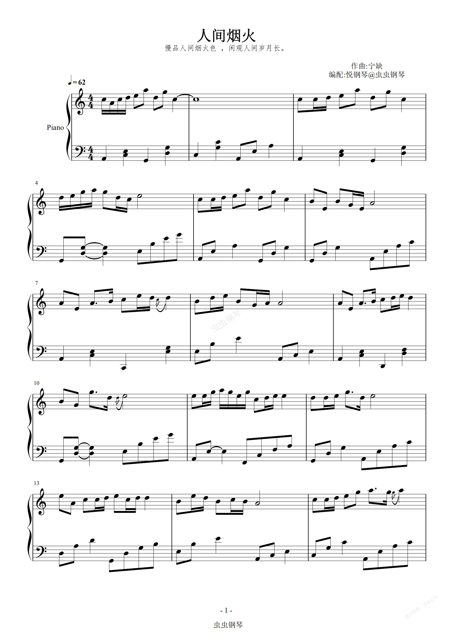 钢琴谱:人间烟火 (C调版)程响