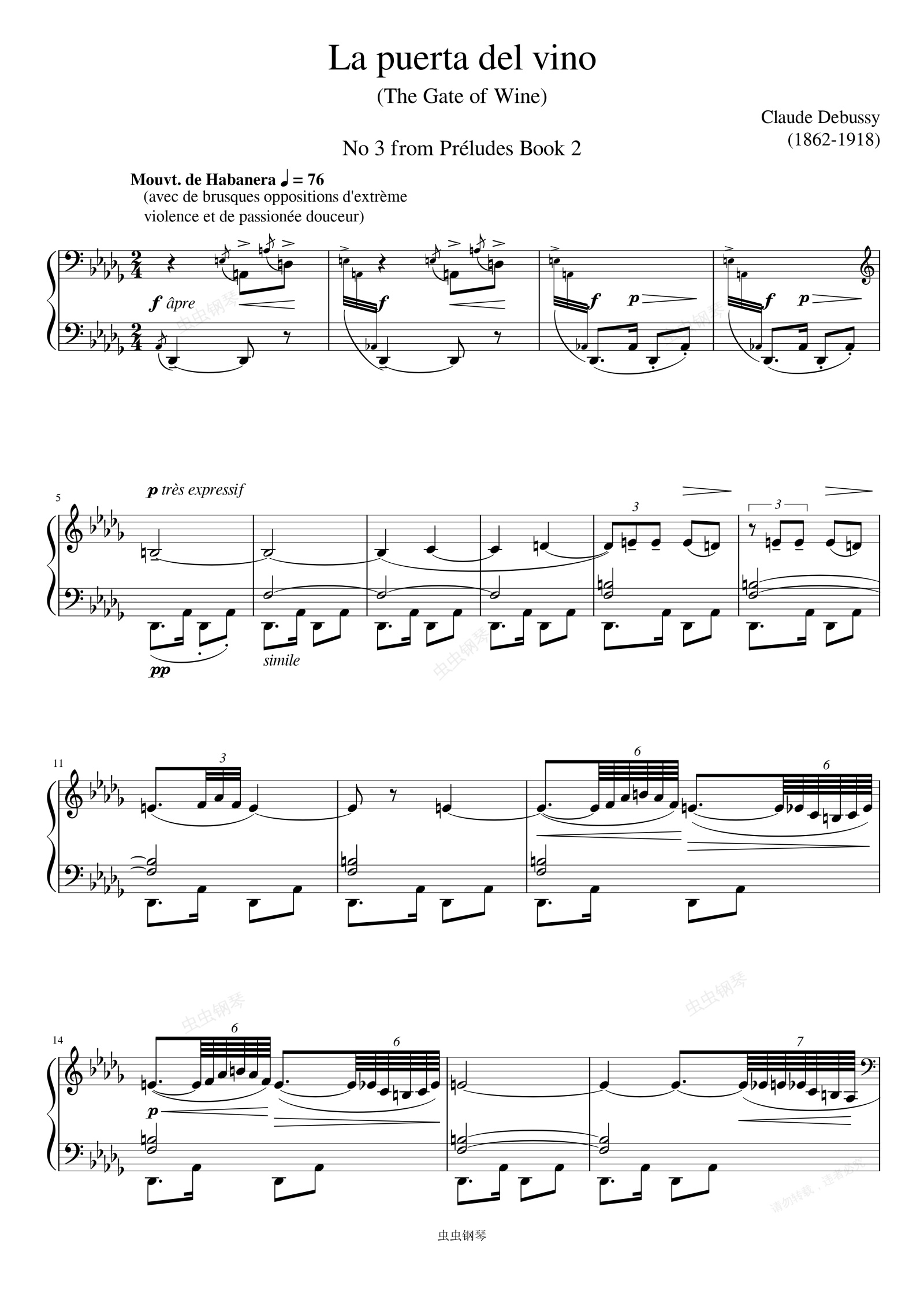 钢琴谱:Debussy Prelude Book 2 No 3 La puerta del vino