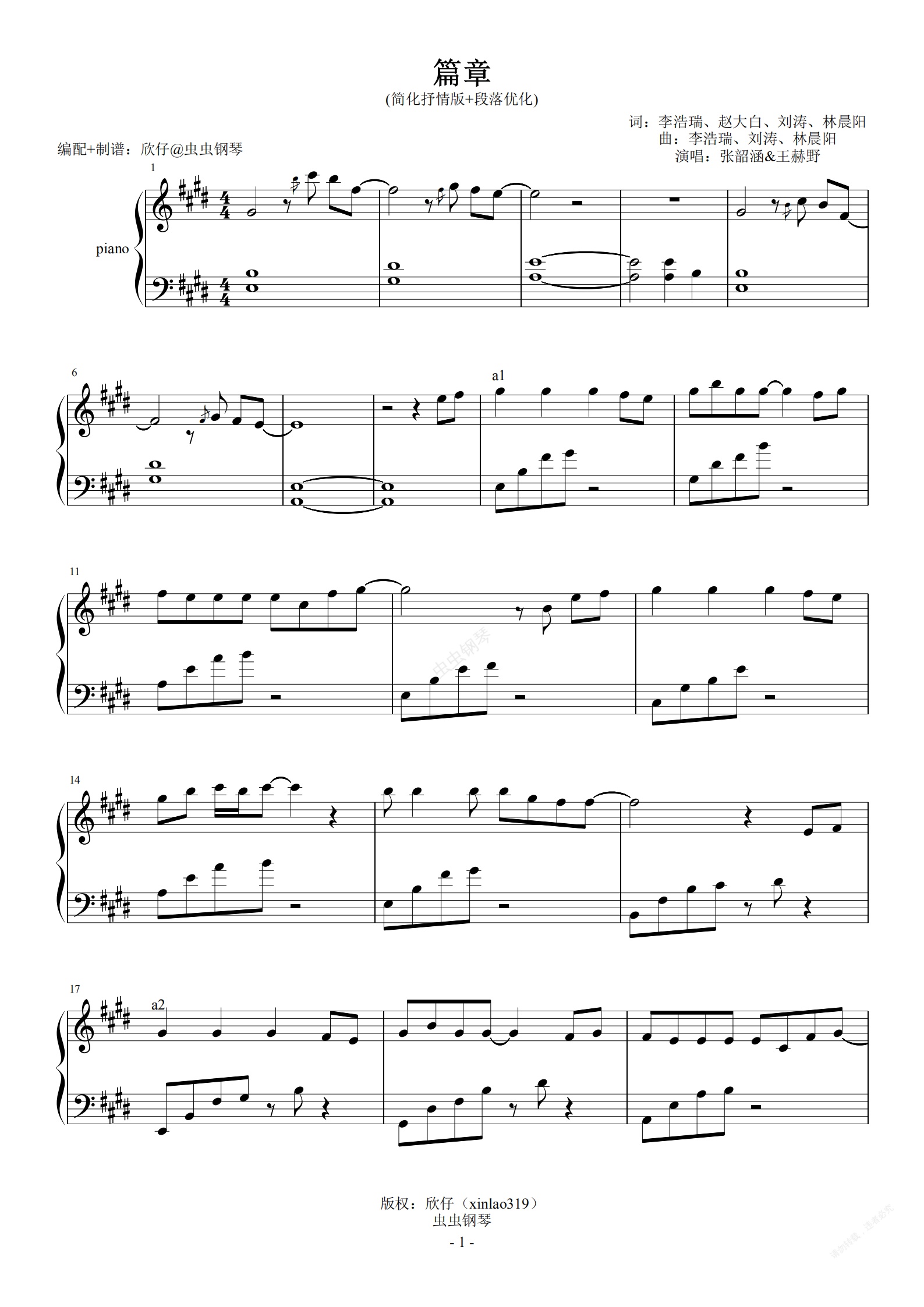 钢琴谱:简化抒情版-E转B《篇章》(王赫野&张韶涵、段落优化)