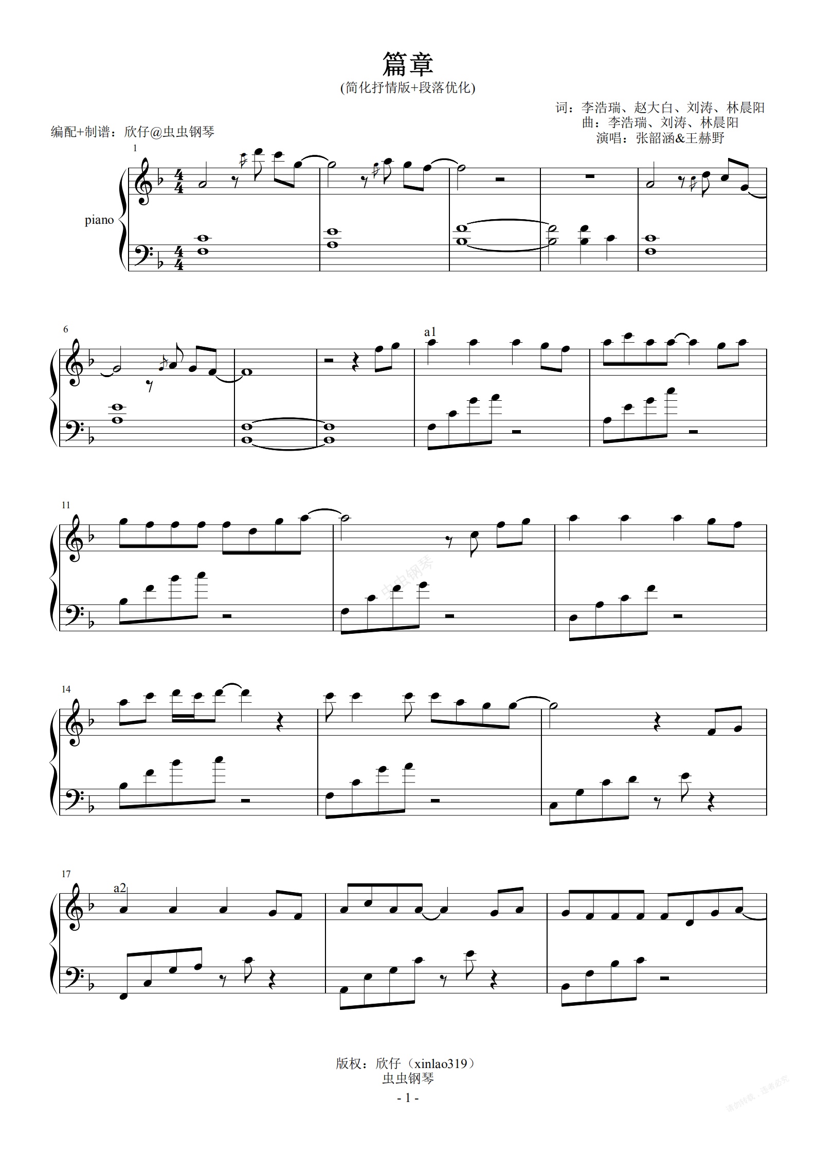 钢琴谱:简化抒情版-F转C《篇章》(王赫野&张韶涵、段落优化)