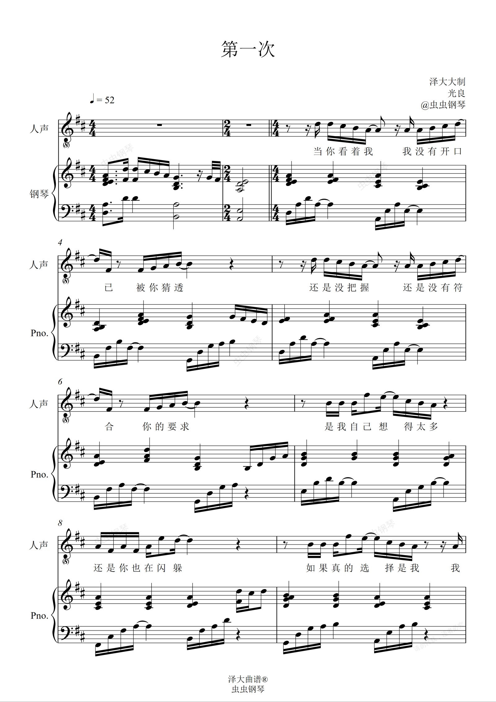 钢琴谱:第一次【女生D调弹唱附词】520表白曲 泽大大 光良